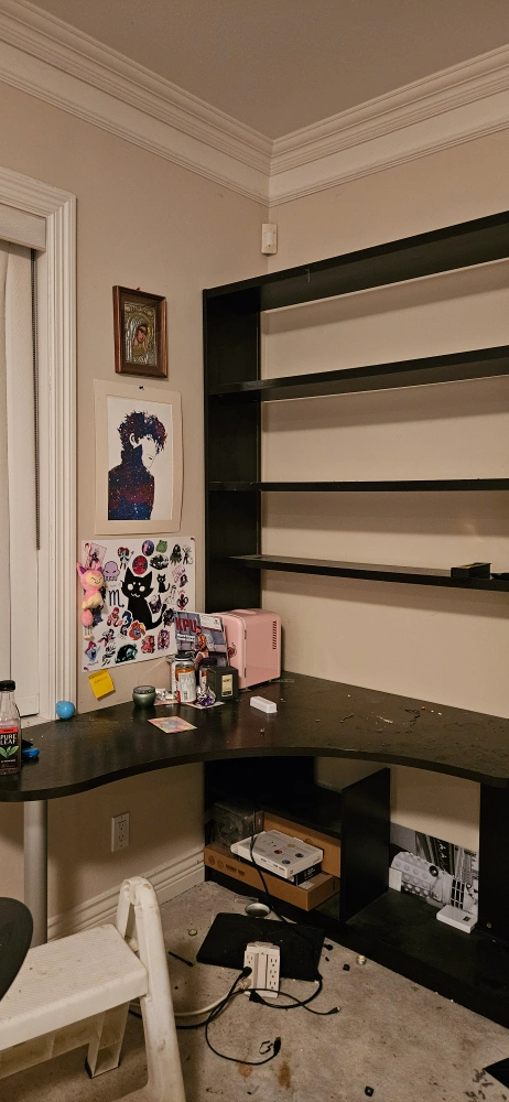 Corner computer desk with attached bookshelf in great condition. Dark brown laminate finish. Includes multiple drawers and shelves. Good for a home office or gaming setup.