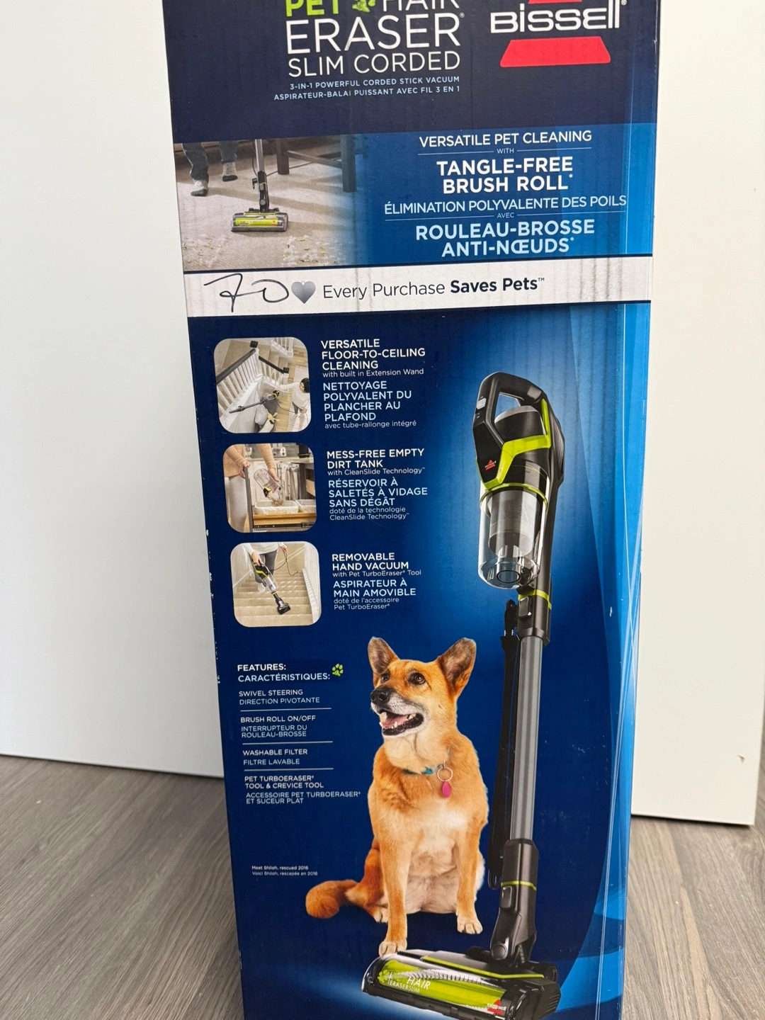 75TANGLE-FREE BRUSH ROLL. Our patented brush roll is designed to eliminate annoying hair wrap. 3-IN-ONE CAPABILITIES. Transform this machine from a stick vacuum to a handheld or high-reach vacuum with ease. SPECIALTY TOOLS INCLUDED. Comes with Crevice Tool, and Dusting Brush to clean hard-to-reach dirt and messes. MESS-FREE MAINTENANCE. Featuring CleanSlide Technology, this machine works with the Easy Empty Dirt Tank for stress-free cleanout. SWIVEL STEERING. More manueverability for multi-surface cleaning and the ability to tackle hard-to-reach places. Item Weight 4.2 kg Dimensions 27L x 24W x 119.4H Centimetres Pick up in Mississauga near the intersection of Highways 401 and 403