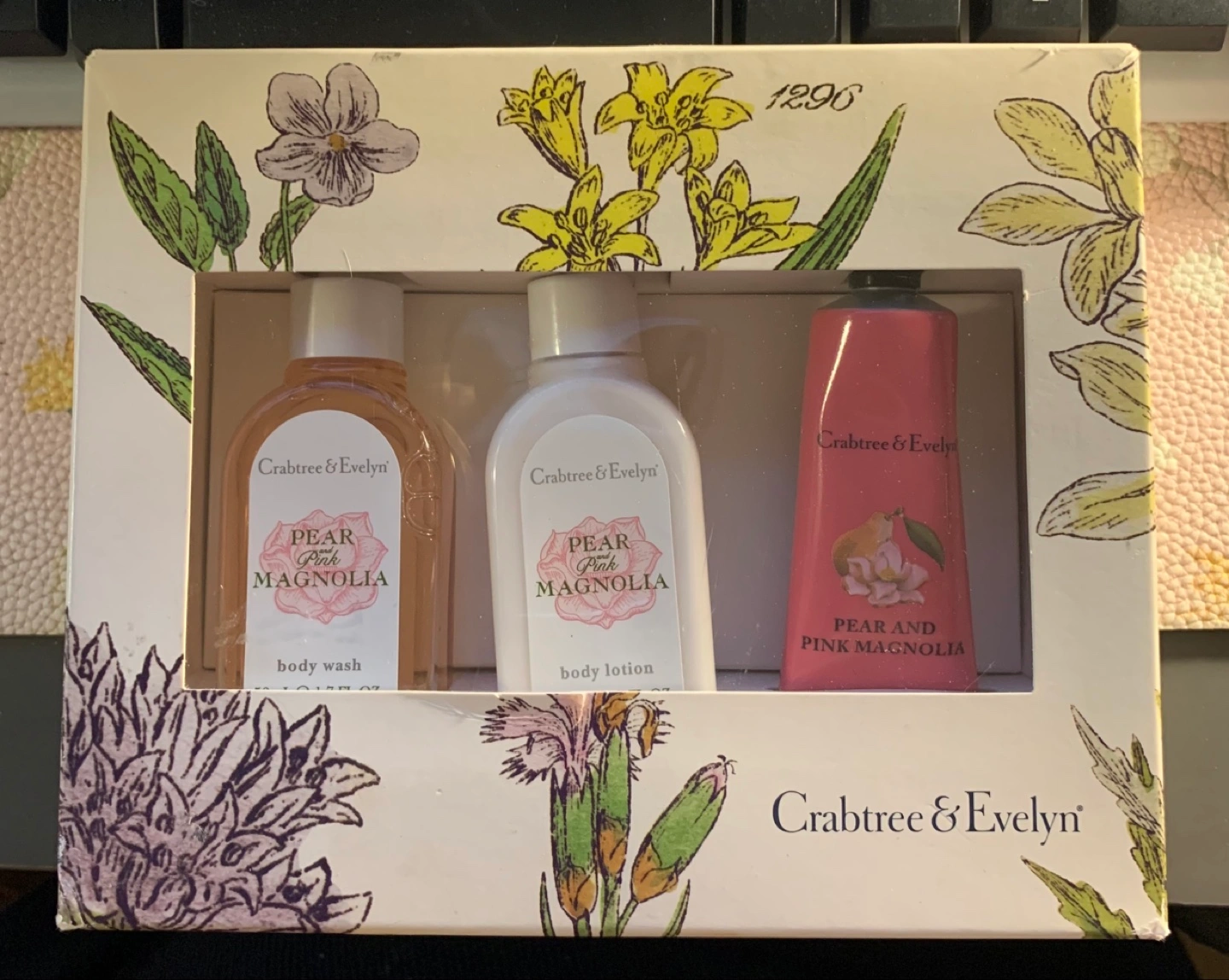 434New Crabtree & Evelyn gift set. Includes body wash, body lotion, and hand cream. Pear and Pink Magnolia scent. All are 50ml size.