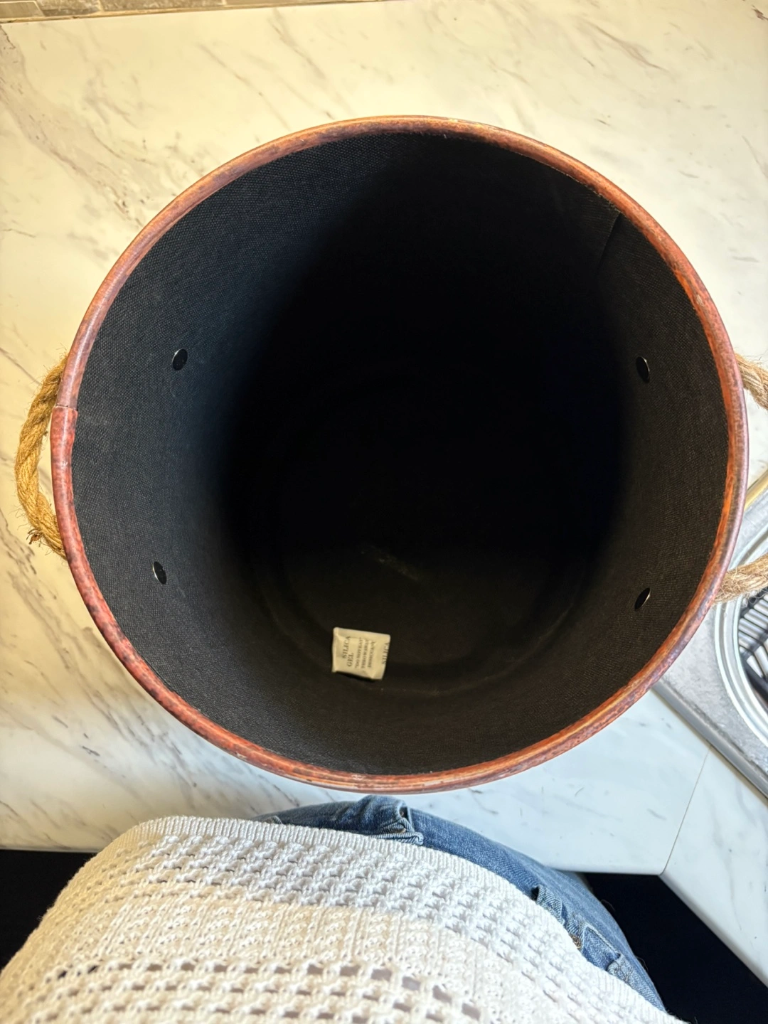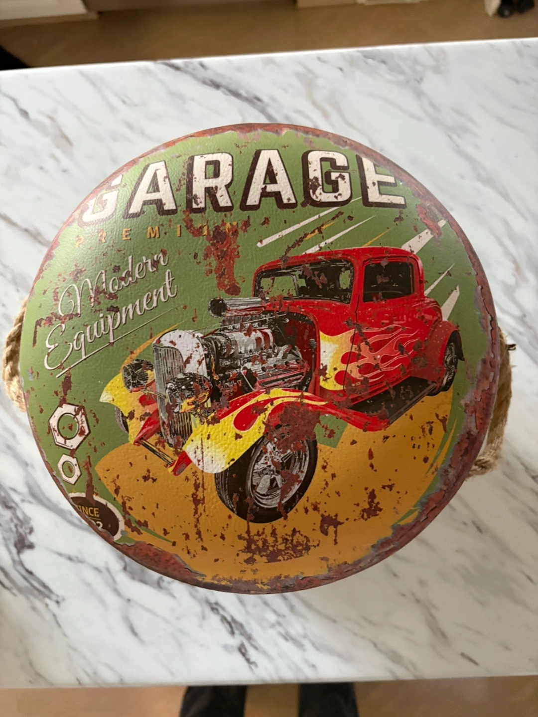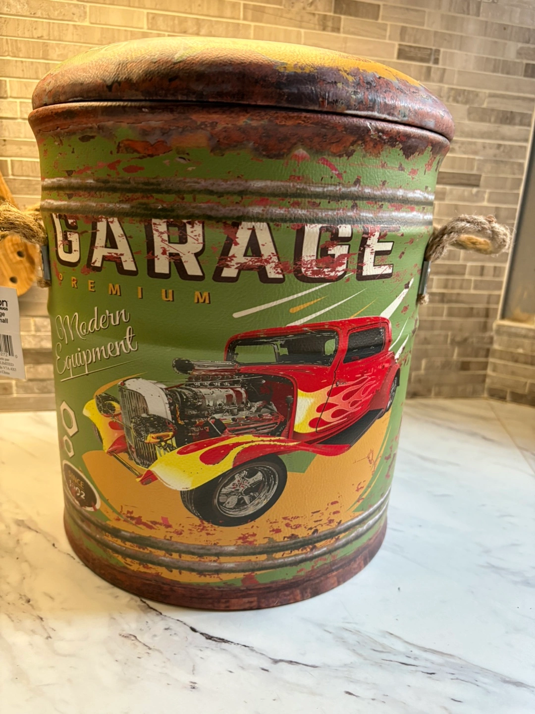 Features a vintage garage theme with a hot rod graphic. Rope handles. Lined interior. Great for blankets, toys, or other storage needs.