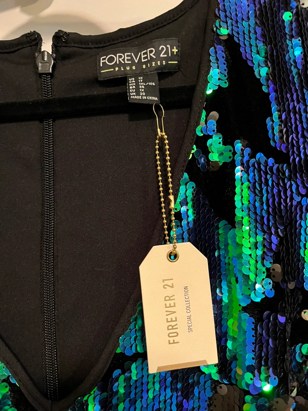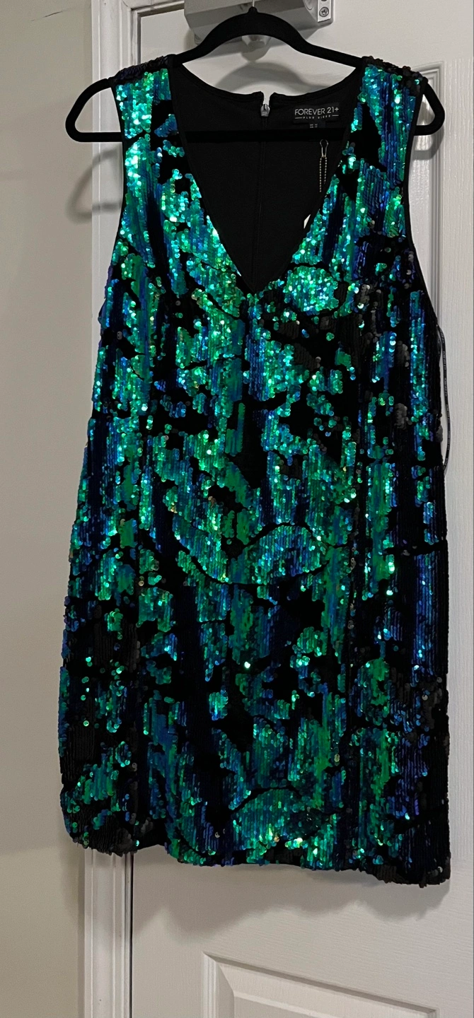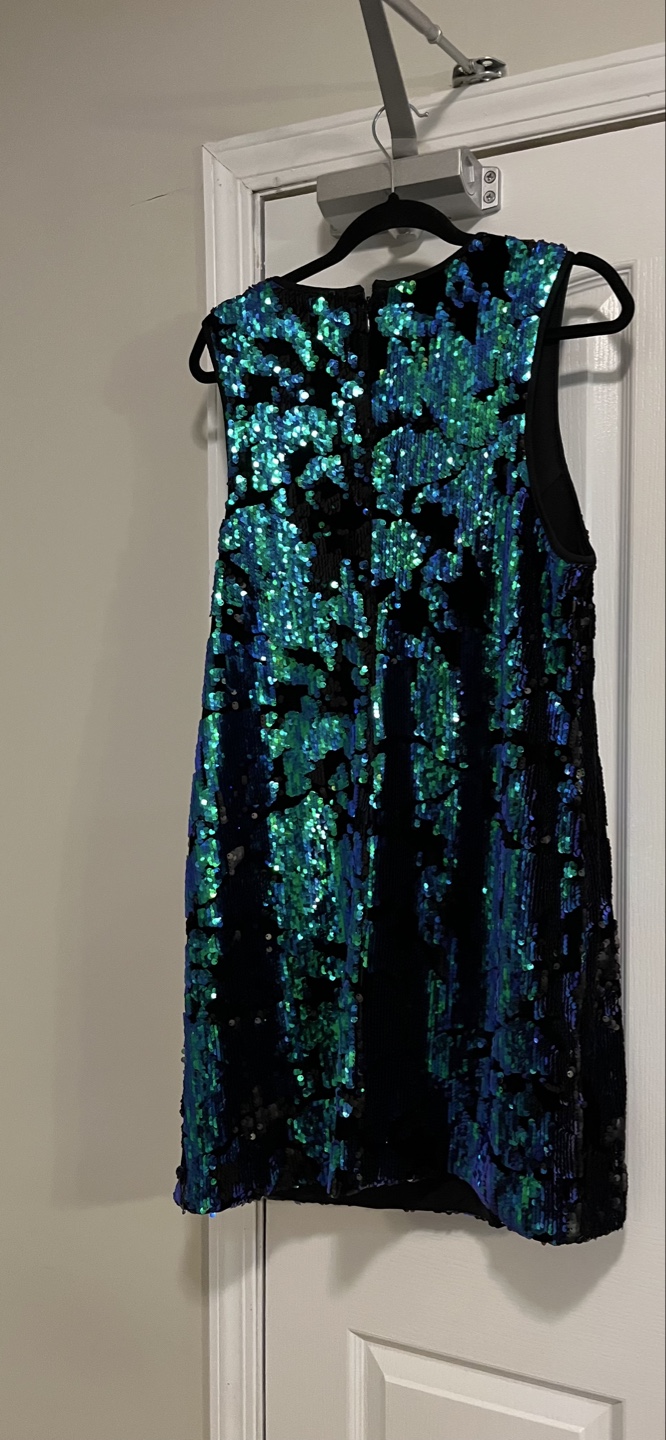 Gorgeous sequin mini dress. Size 1X. Teal and green sequins on black velvet. Sleeveless, V-neck. Back zipper closure. Special collection.