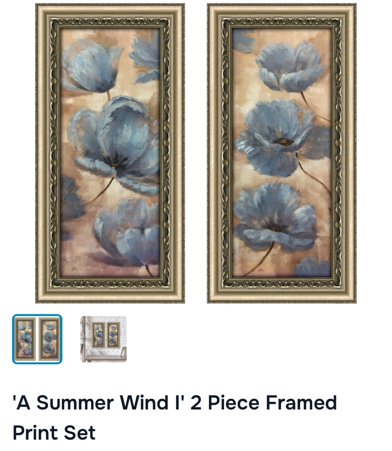 89Two-piece framed wall art. Features blue poppies on a beige background. Elegant gold frames. Perfect for living rooms, bedrooms, or offices. Measures 29"L x 13"W each. Purchased at Wayfair $77.99 +