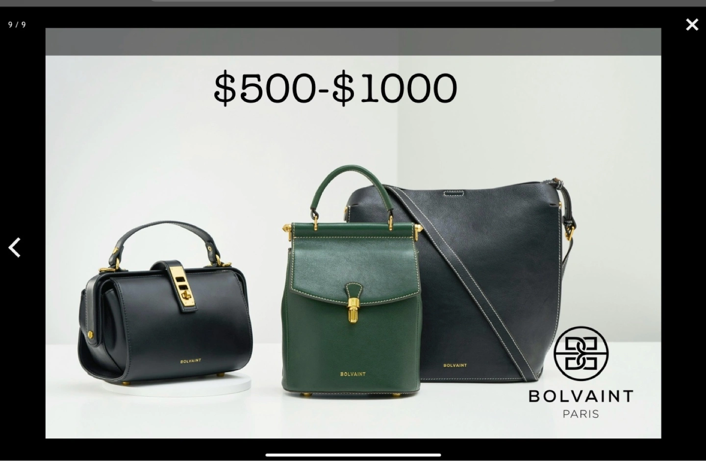 Three designer handbags. Black, green, and black and white color options. Various styles and sizes. Gold hardware accents.