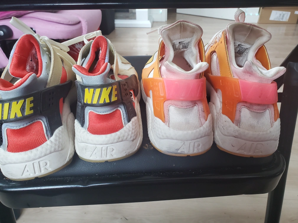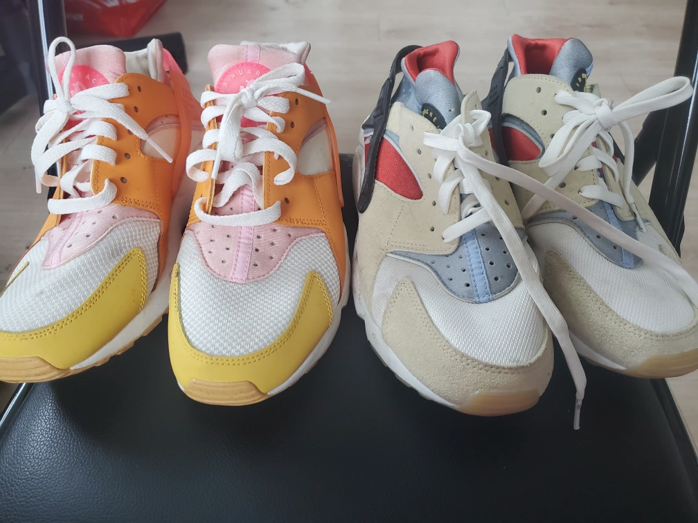 Two pairs of Nike Air Huarache sneakers. Various color schemes. Good condition. Women's sizes. The pink with orange size 10 and beige/cream size 9 both have original boxes