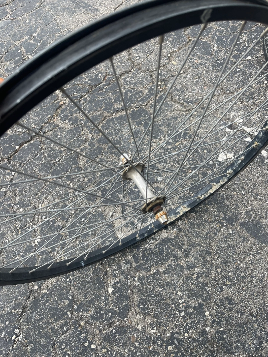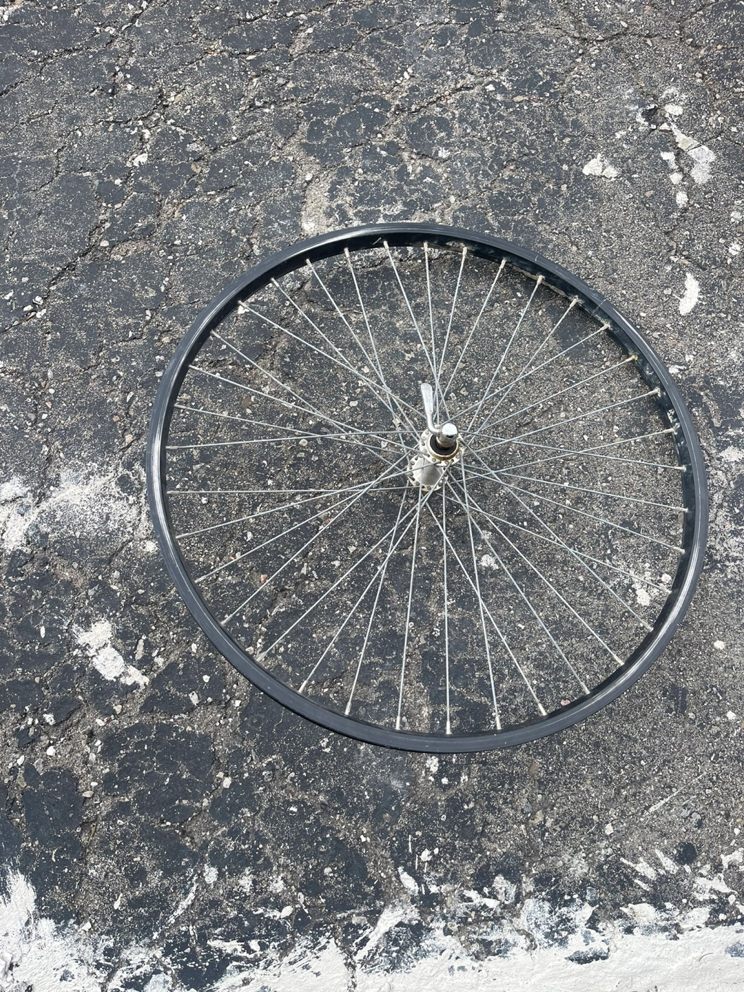 242Single bicycle wheel. Black rim, silver spokes. Used condition. Suitable for repair or replacement.