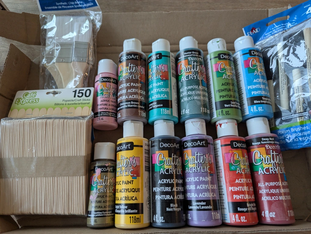 Set of DecoArt Crafter's Acrylic paints. Includes various colours. Also includes a synthetic chip brush and 150 popsicle sticks.