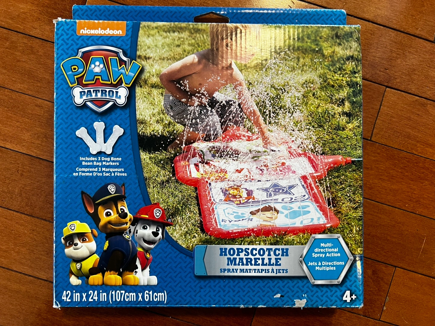 Inflatable Paw Patrol hopscotch water mat. Includes three dog bone markers. Great for outdoor summer fun. Open box. Never used. Suitable for ages 4+. Pick up only.