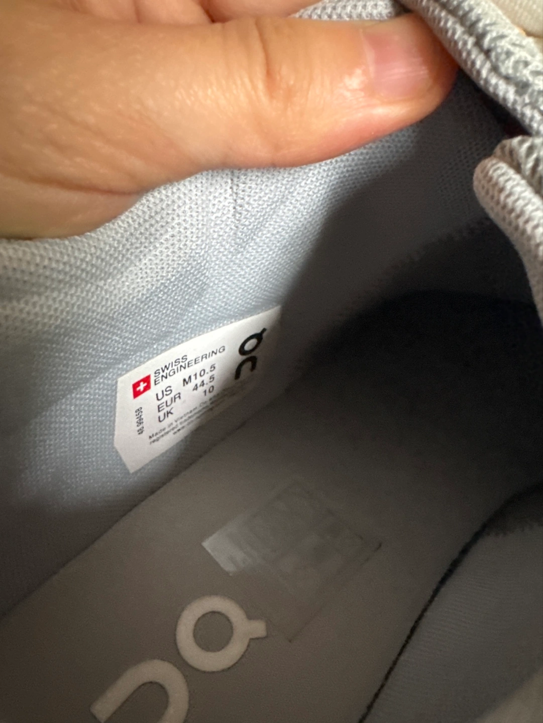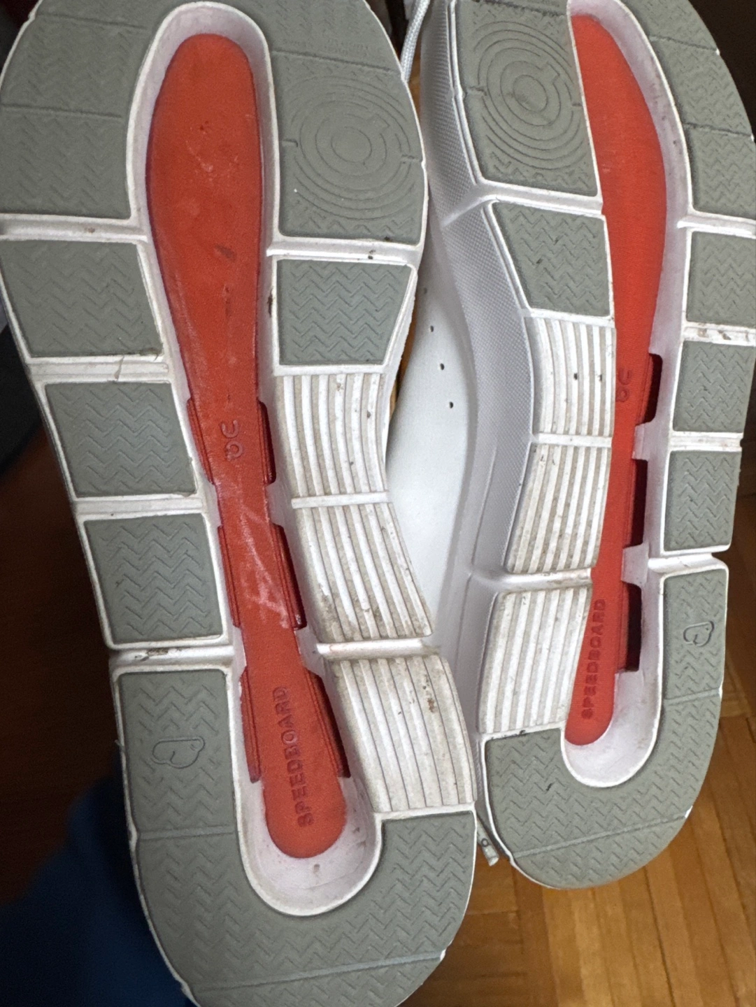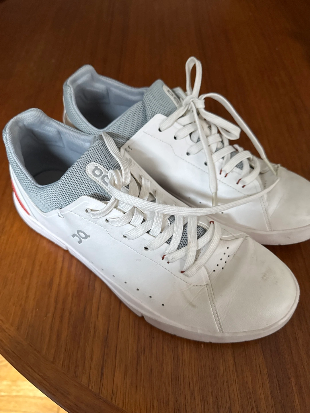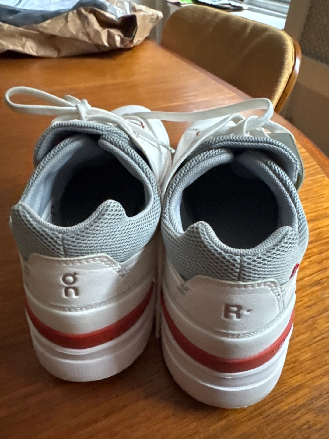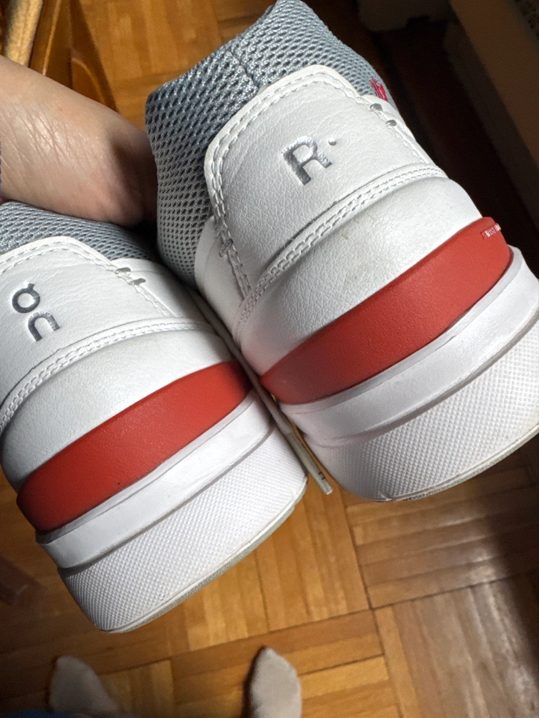 White leather sneakers with gray mesh accents. Red detailing on the sole and heel. Size US Men's 10.5. Good condition.