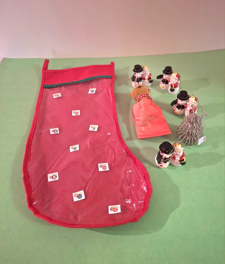 For a fraction of retail price you can buy a snowman wall hanging and garden decoration, 3 large snowflakes, 2 snowman sun catchers, silver and gold coloured bells, 2 plastic candles, a hanging stocking, assorted tree ornaments, cards and stickers, and more.