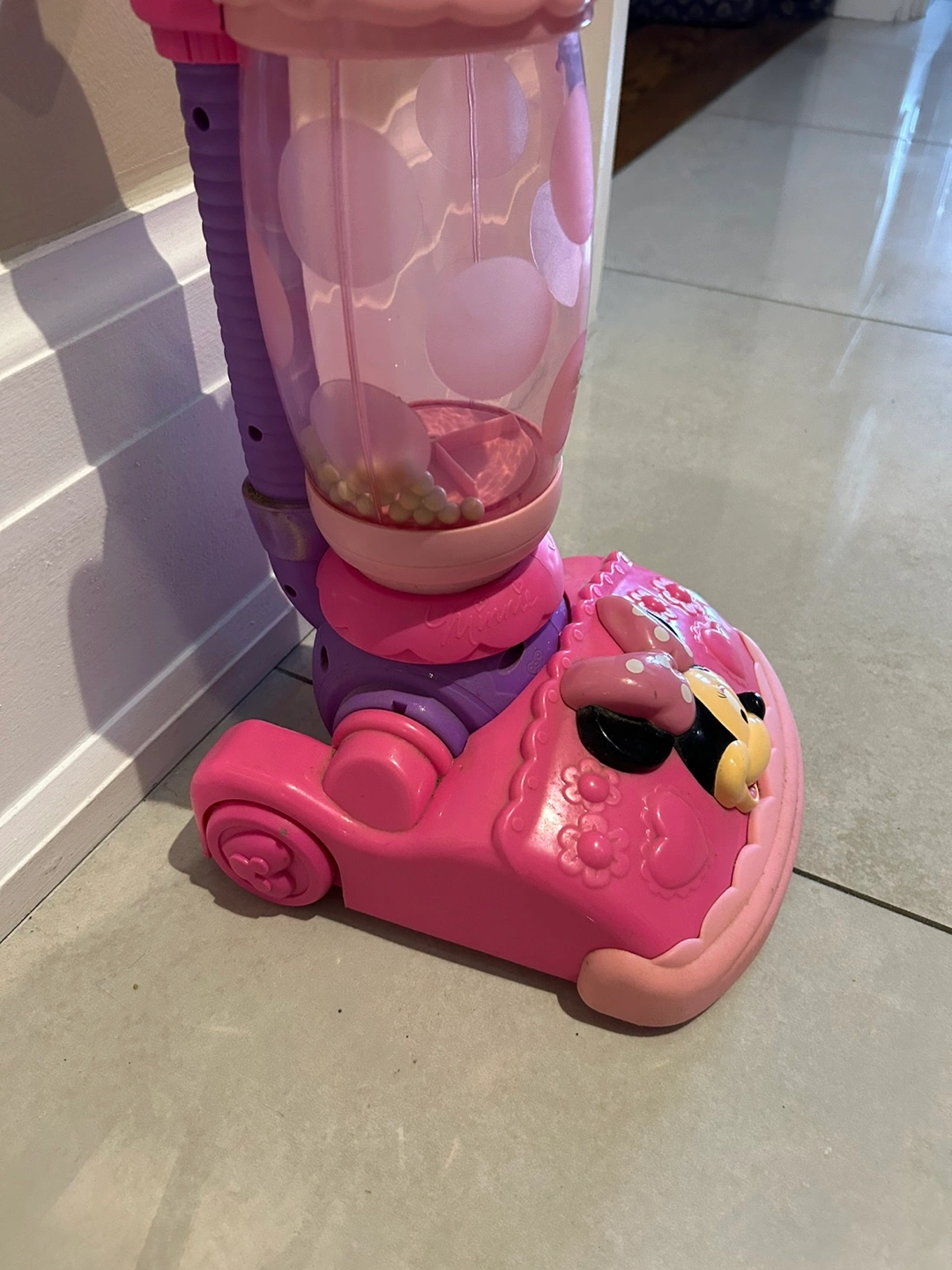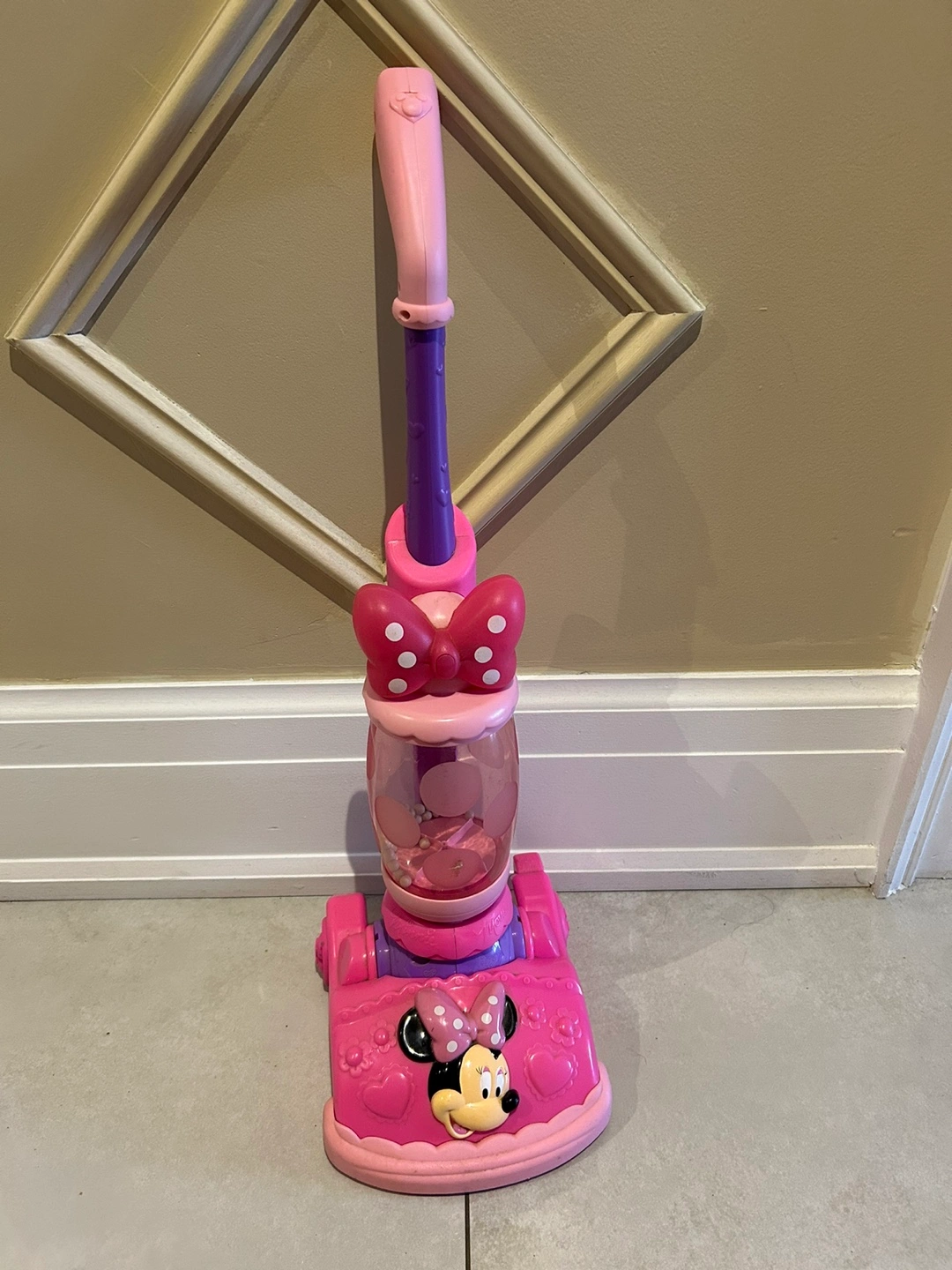 Minnie Mouse pink and purple plastic toy vacuum. Includes a clear dust container. Great for imaginative play.