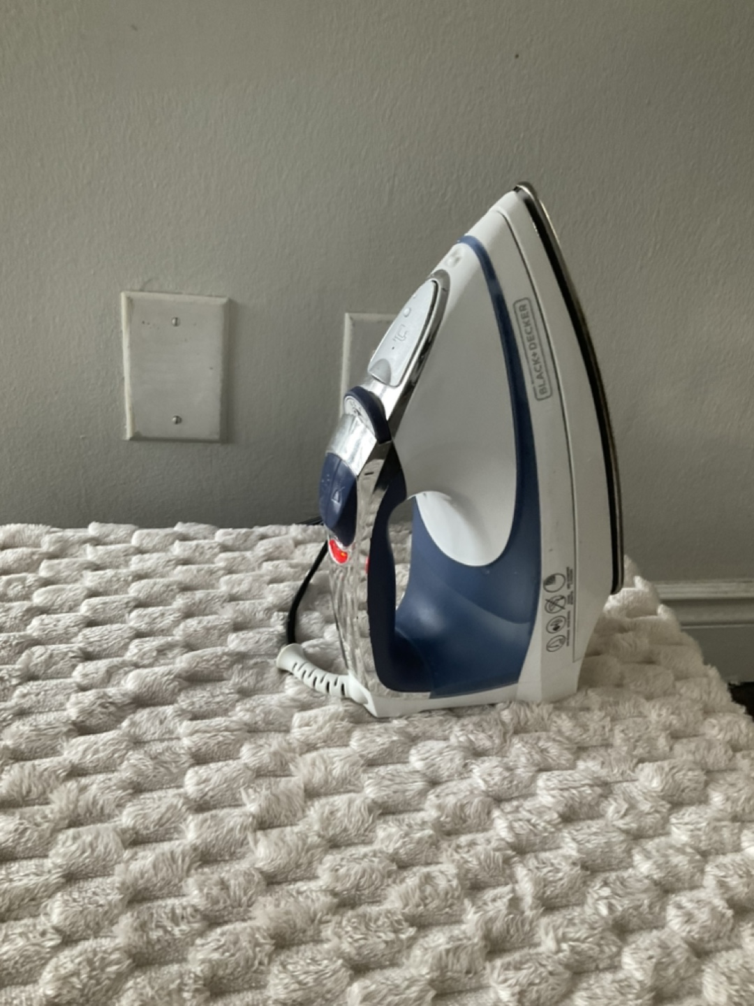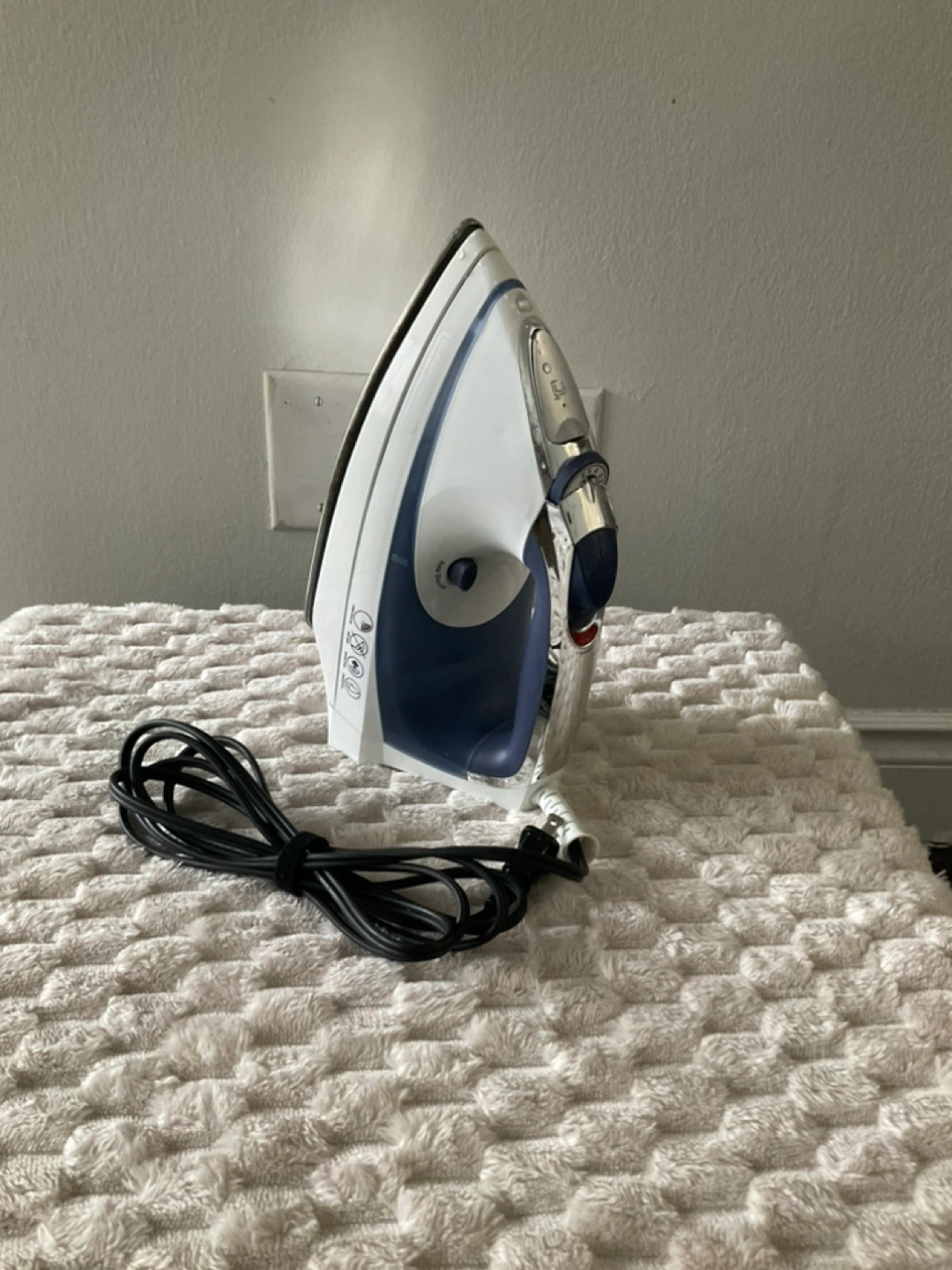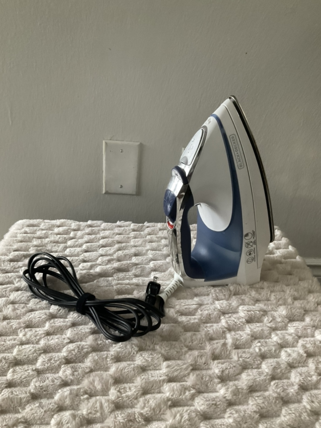 Used Black+Decker steam iron. Features a long cord and various steam settings. Great for wrinkle-free clothes.
