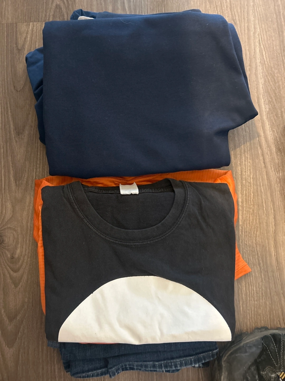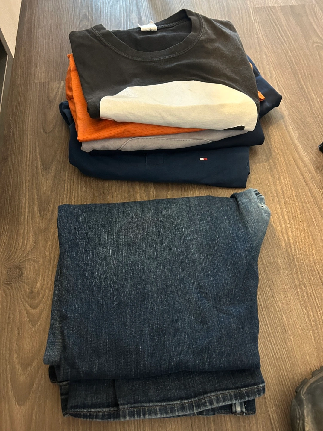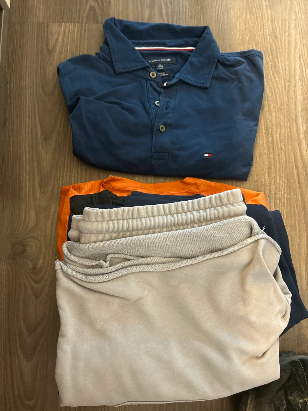 Includes a navy Tommy Hilfiger polo shirt, 2 sports t-shirts, a pair of GAP jeans (they have a rip that can easily be fixed or hidden), a pair of Aeropostale sweatpants and a pair of shorts. Great value! Sizes vary between XL and Large.