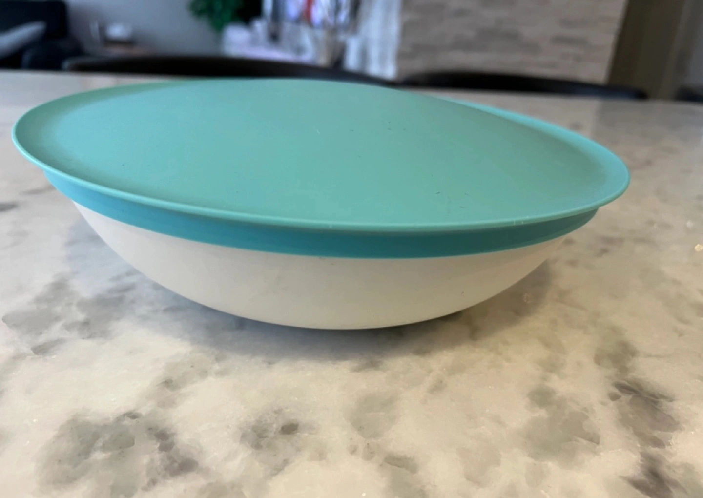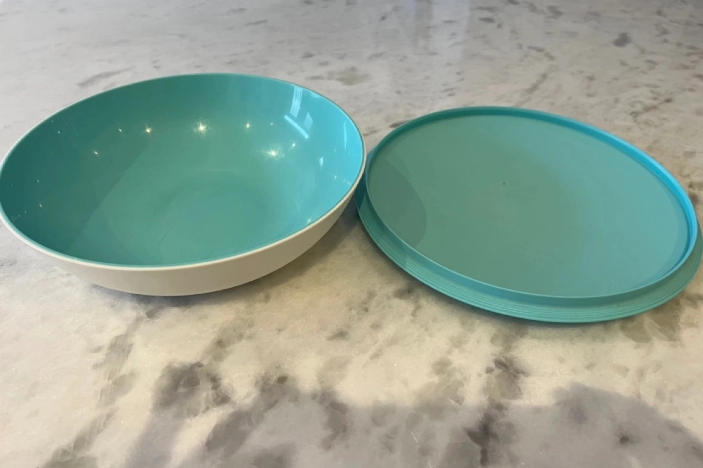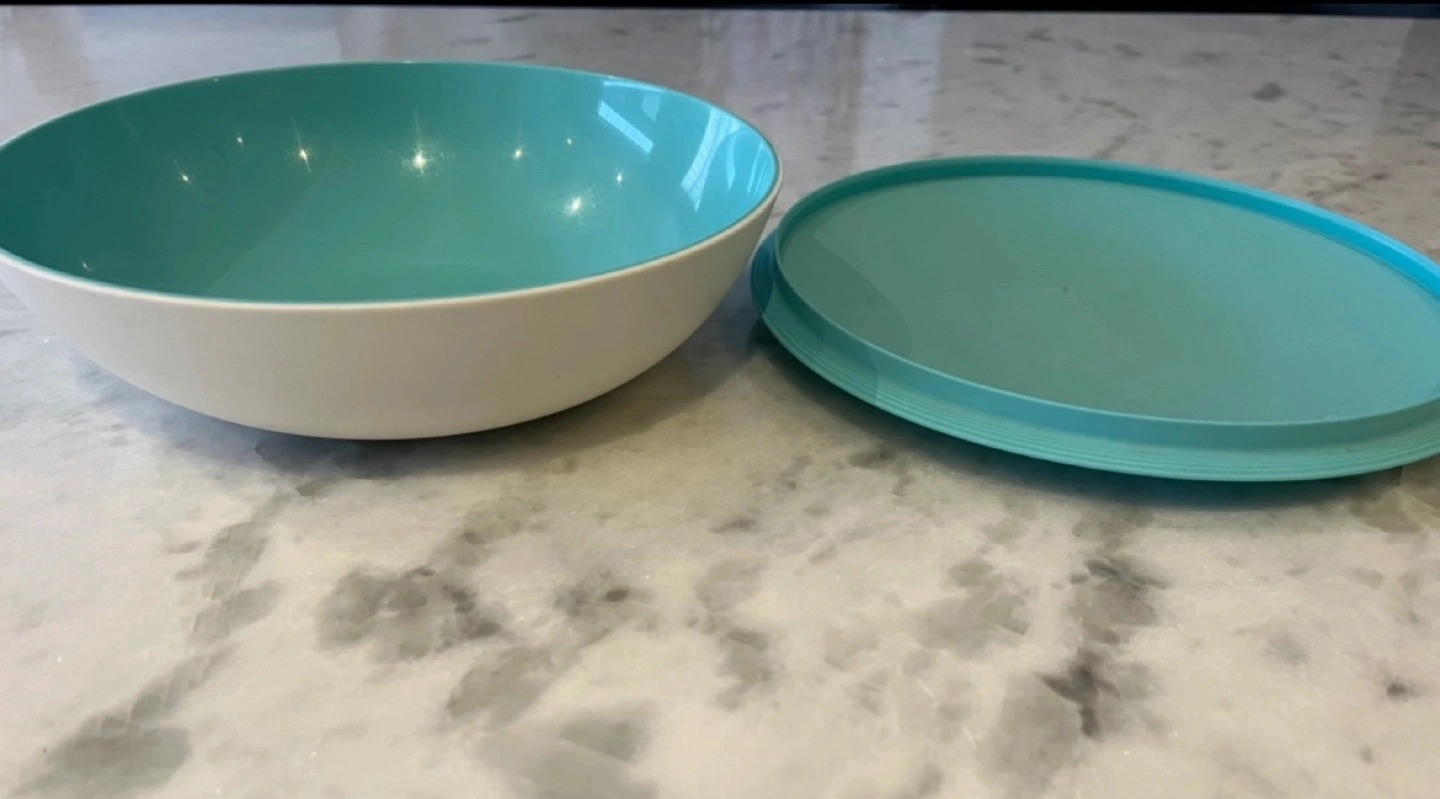 Tupperware brand serving bowl. Teal and white. Includes a matching lid. Great for leftovers or serving snacks.