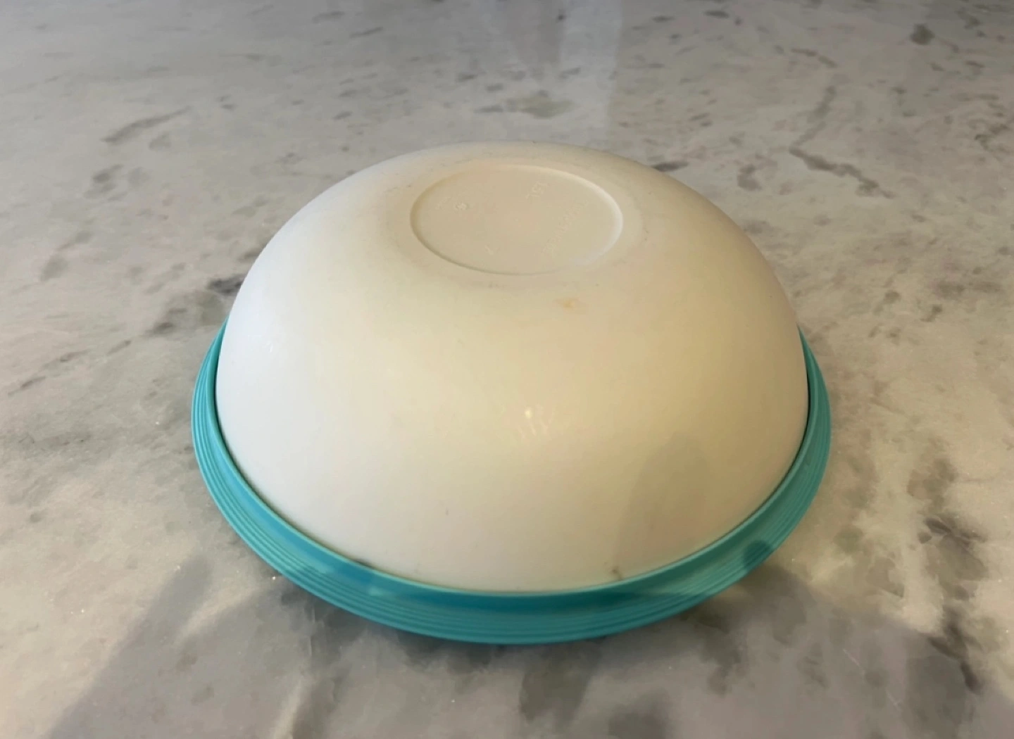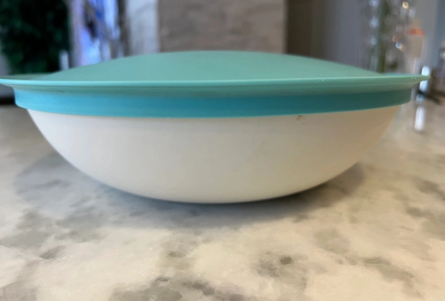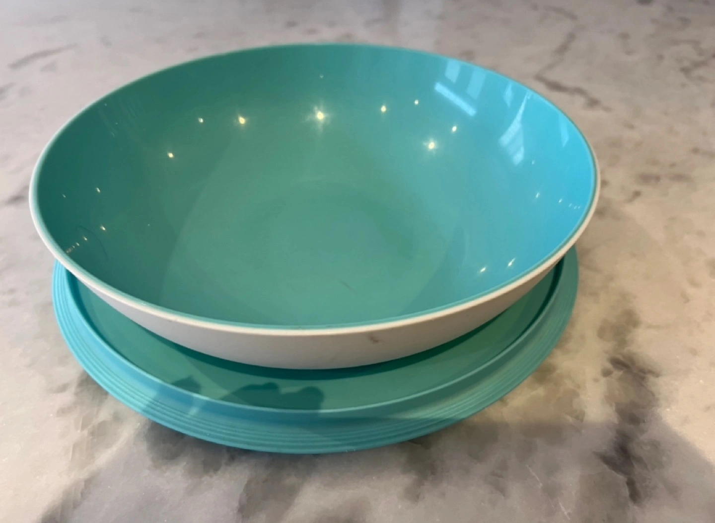 Tupperware brand serving bowl. Teal and white. Includes a matching lid. Great for leftovers or serving snacks.