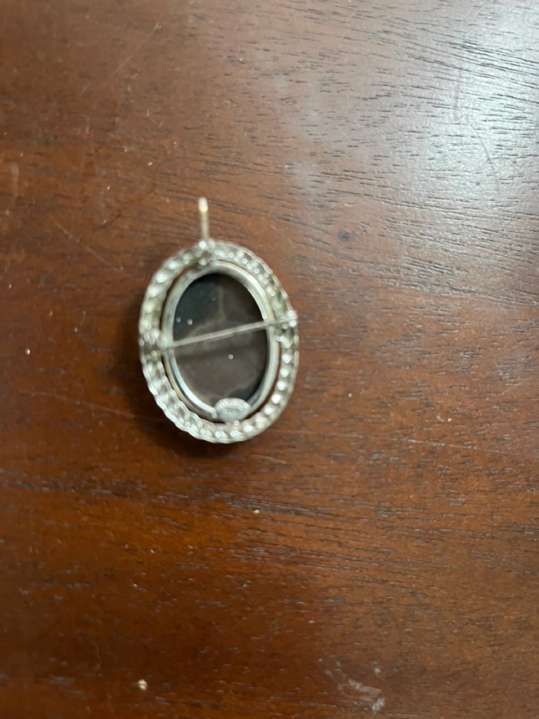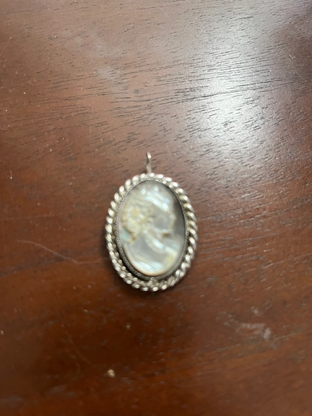 Oval cameo pendant. Features a delicate, carved shell cameo. Sterling Silver frame with a twisted rope design. Lovely addition to any jewellery collection.