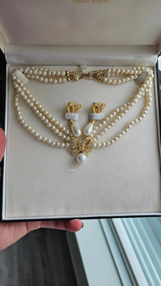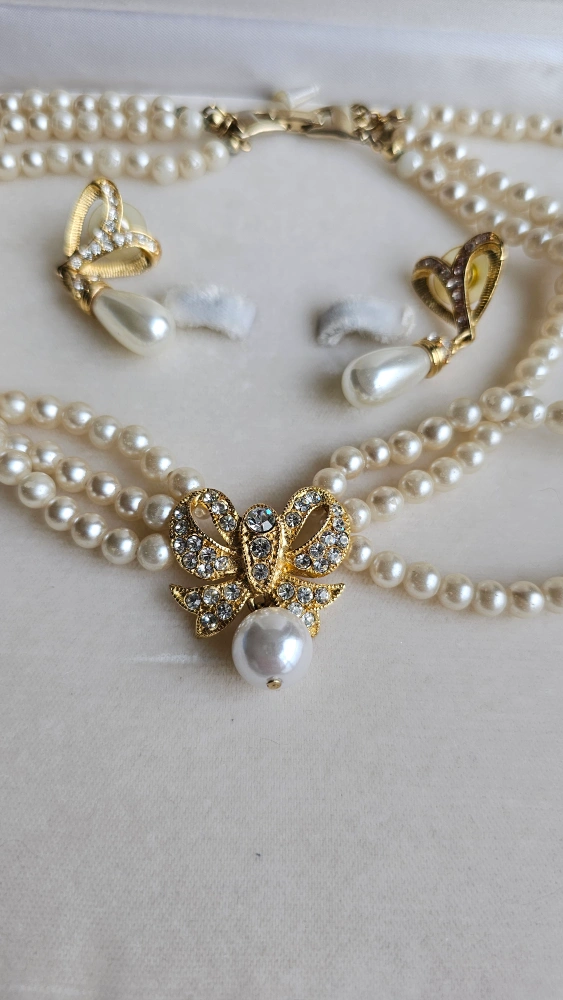 Beautiful three-strand pearl necklace. Features a gold bow pendant with crystals and a single pearl drop - no stones missing. Matching pearl and gold earrings included. Comes in original box. Looks great for special occasions.