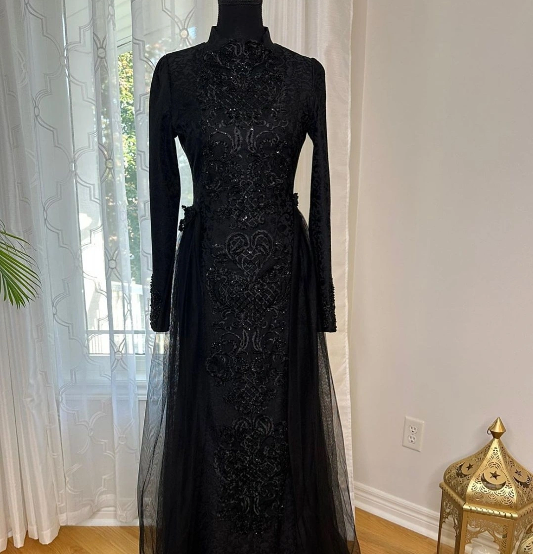 Stunning black formal dress. Long sleeves, high neck. Intricate beaded detailing. Features a tulle overlay which can be removed. Perfect for special occasions.Brand New size 36 (size 6/8)