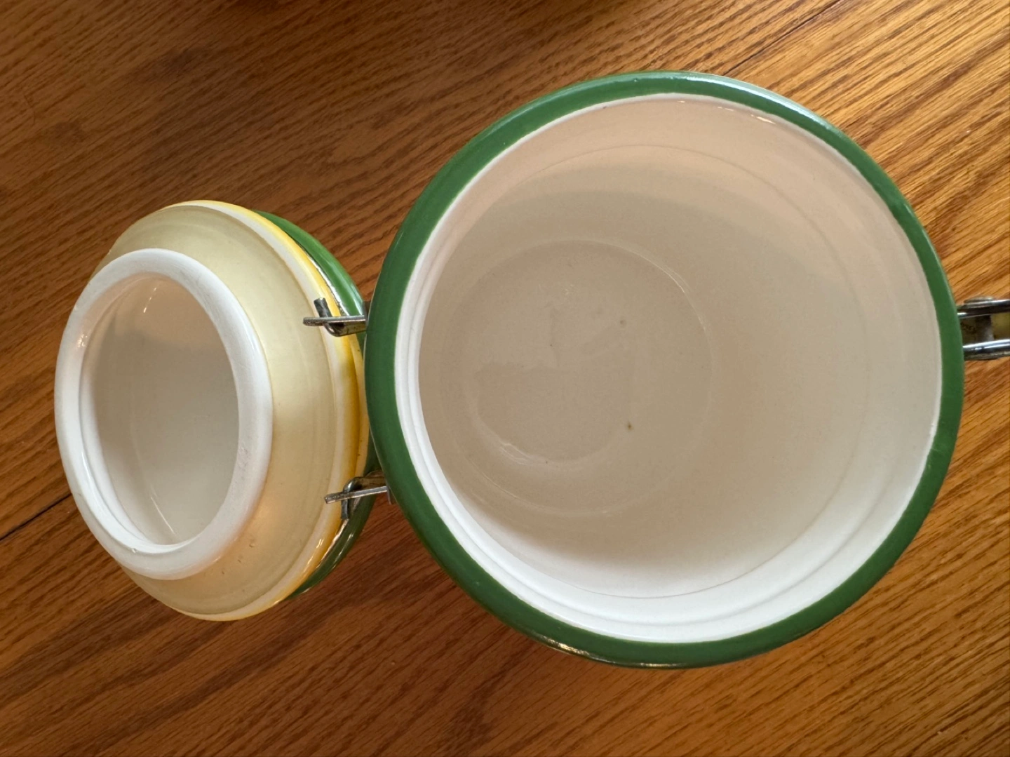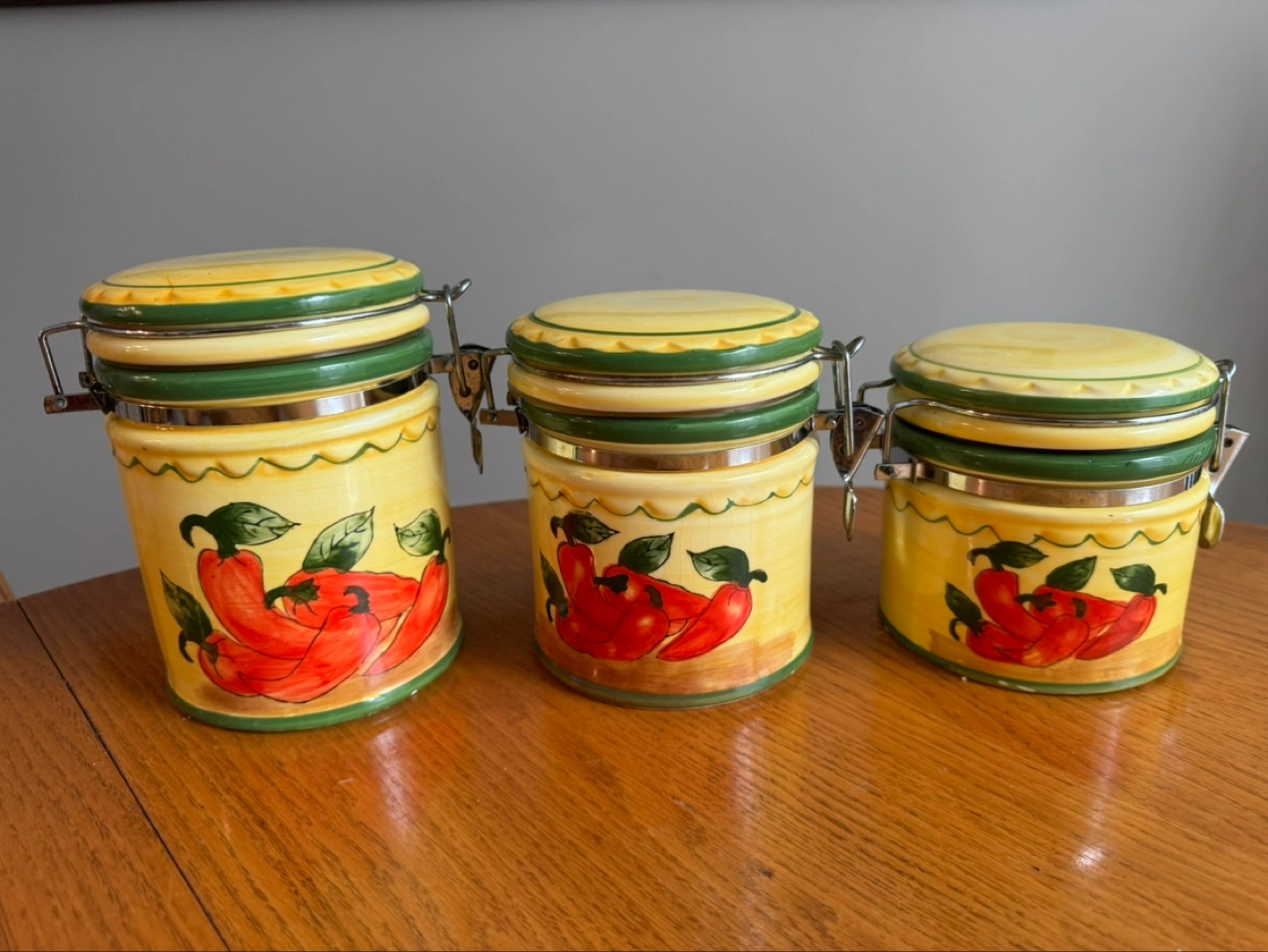 Set of three ceramic canisters - varying sizes. Yellow and green colour scheme. Chili pepper design. Spice up your kitchen decor! Metal clasp closures. Very clean used for decoration only.