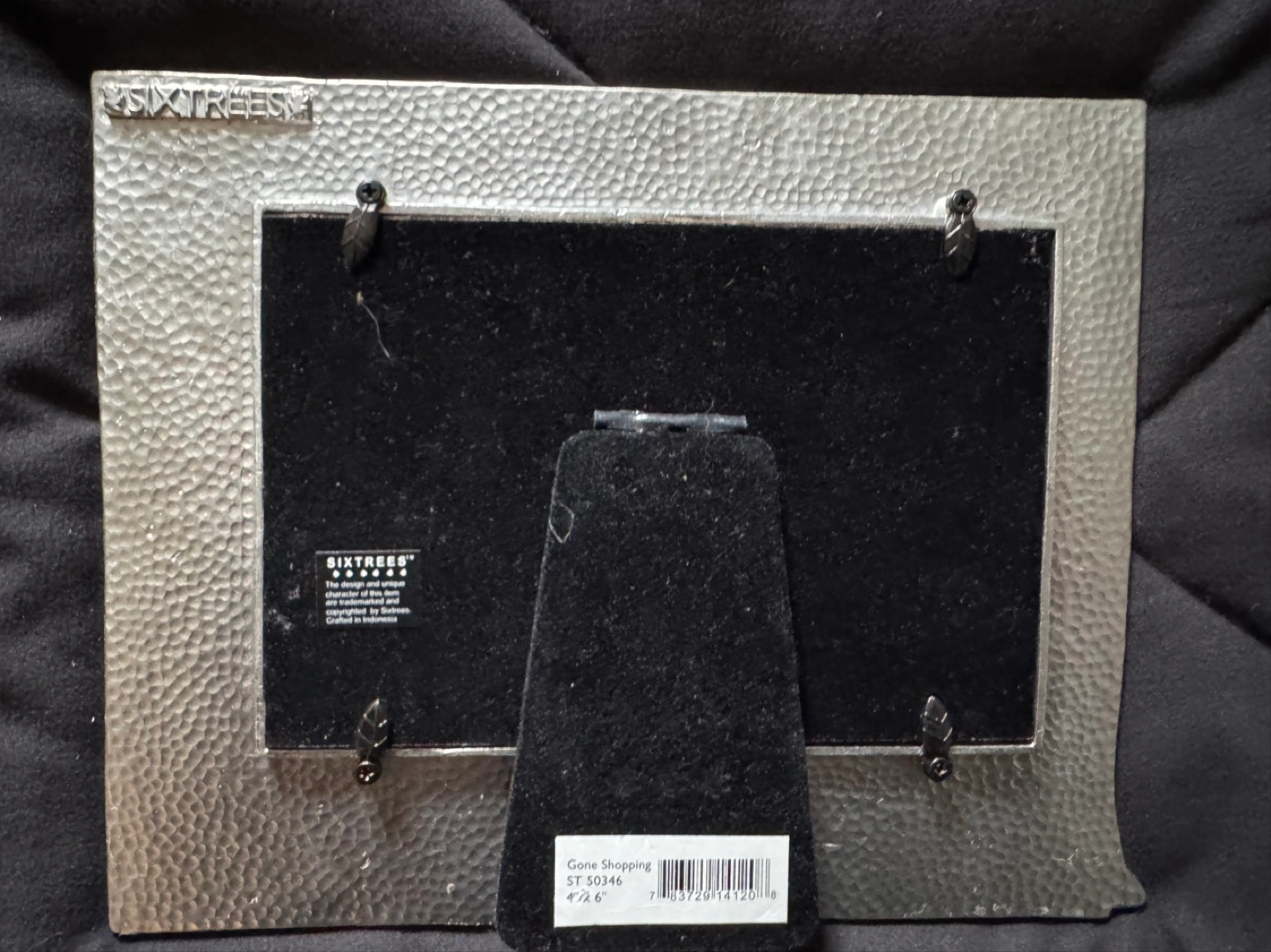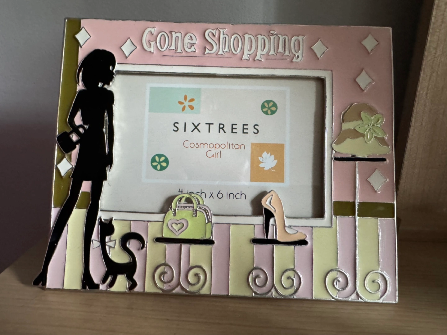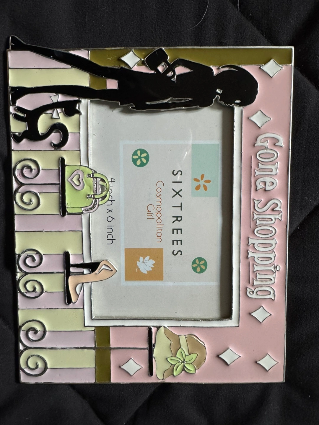 Cute pink and silver metal photo frame. Features a silhouette of a girl shopping. Measures photo size 4x6 inches. New, never used.
