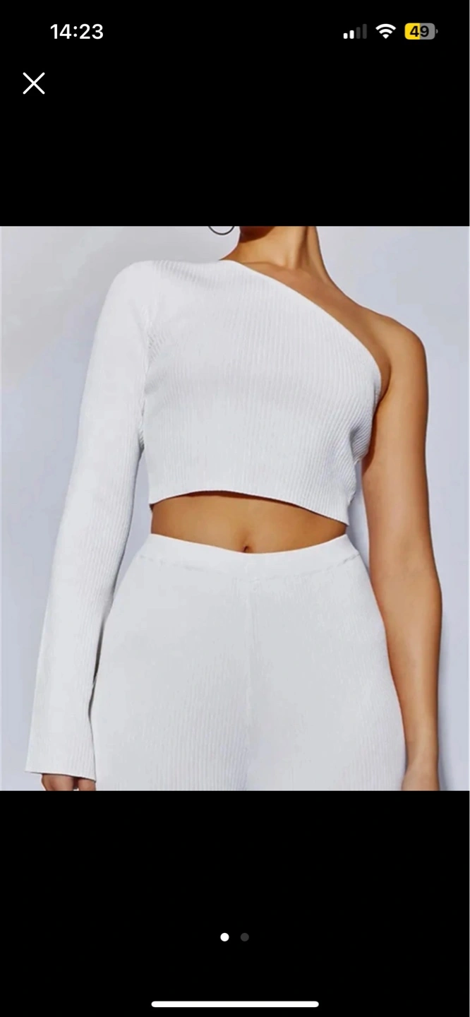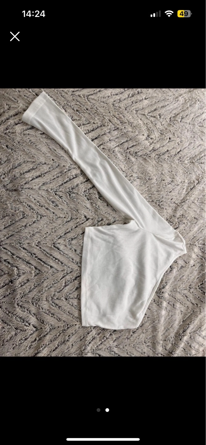 Off-white cropped knit top. One shoulder design. Long sleeve. Great for layering or wearing alone. Part of a two-piece set.