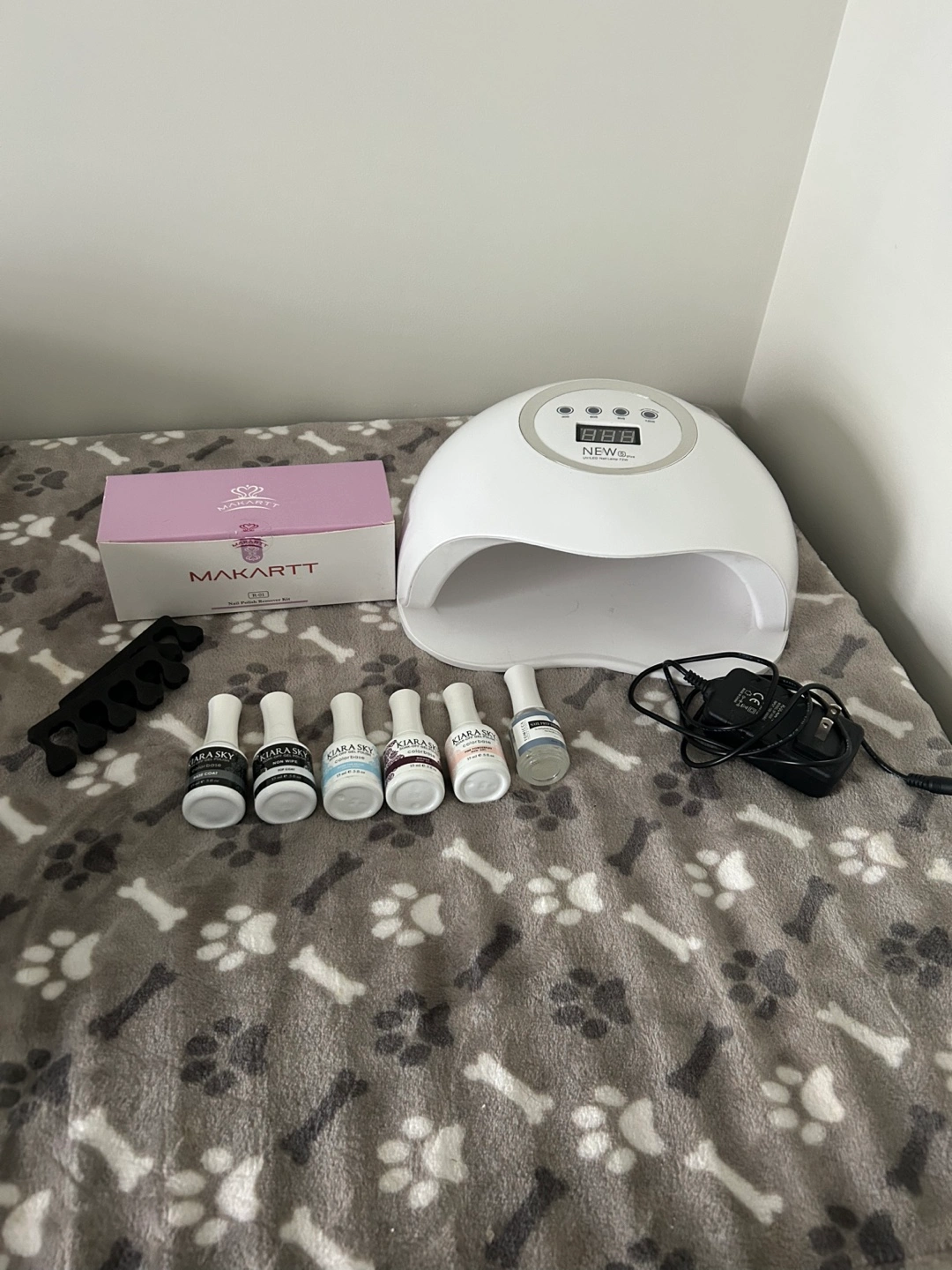 Nail kit includes UV lamp, six Kiara Sky nail polishes, finger separator, and power adapter. Complete starter kit.