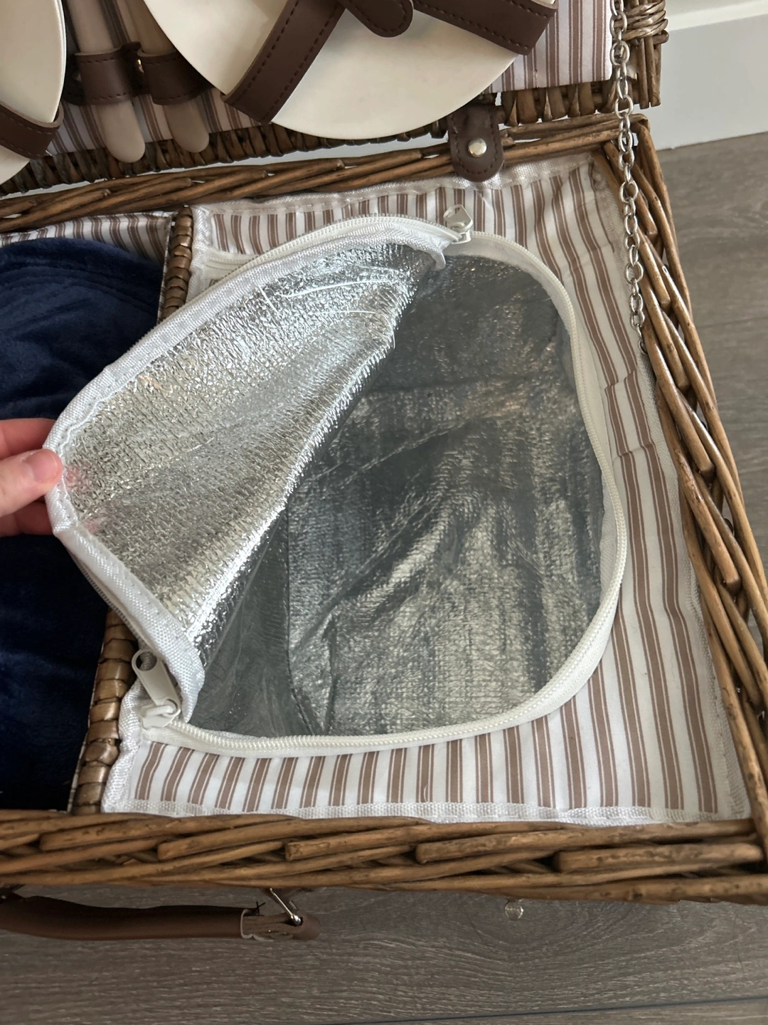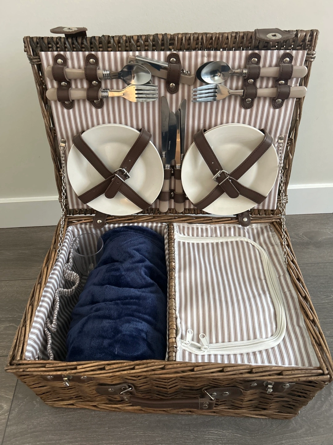Brown wicker picnic basket. Includes plates, cutlery, wine glasses, and insulated compartment. Perfect for outdoor gatherings. Features a blanket and zippered cooler.