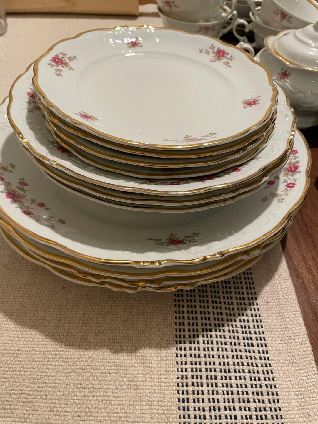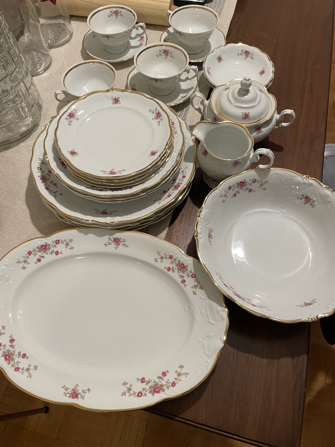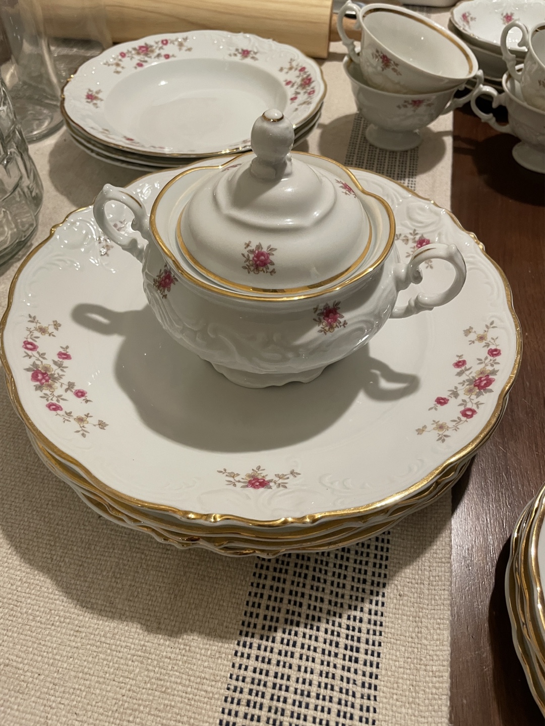Beautiful vintage Rosenthal Romance dinnerware. Includes plates, cups, saucers, creamer, sugar bowl, and serving bowl. Floral design with gold trim. Excellent for formal dining.