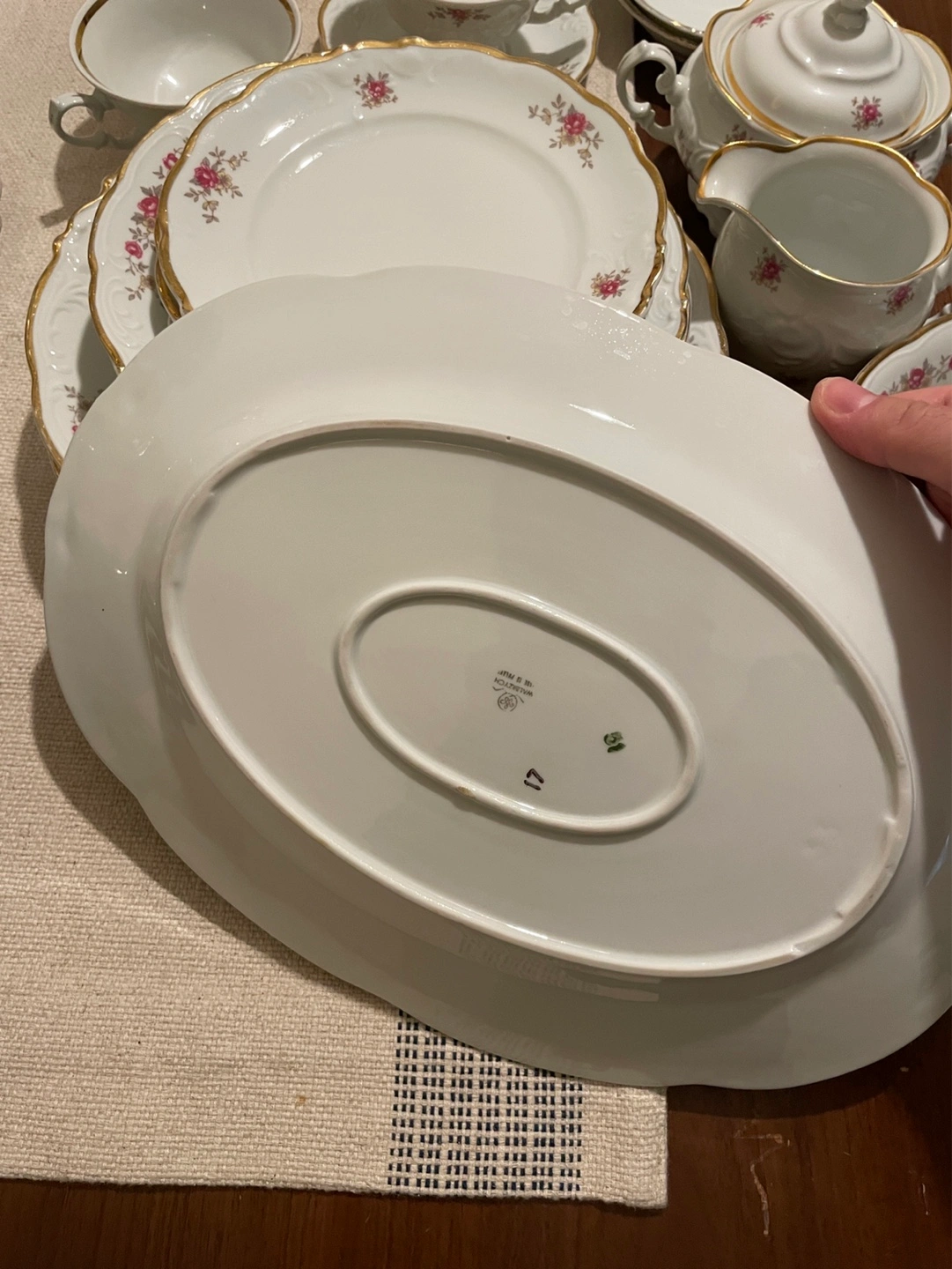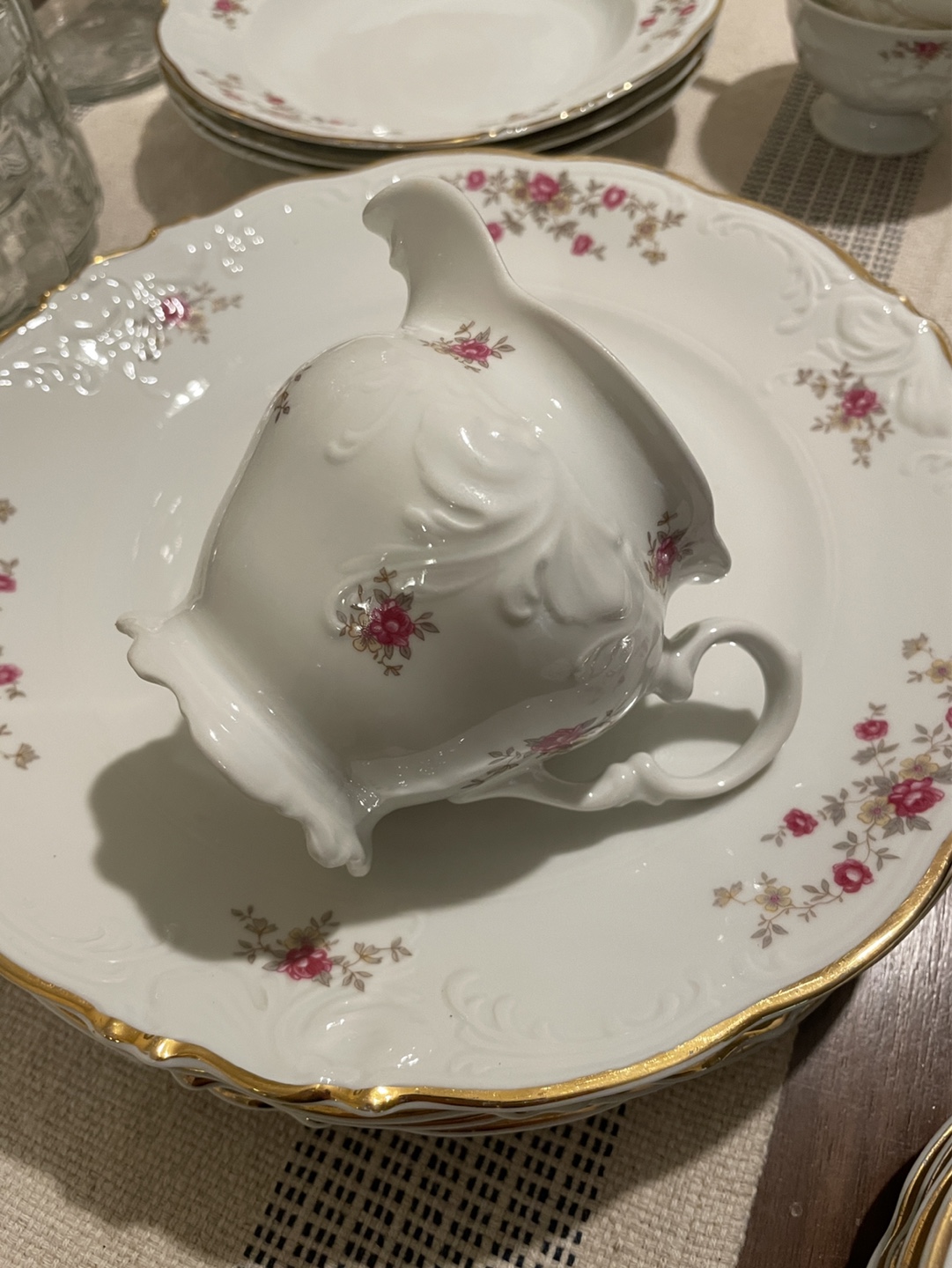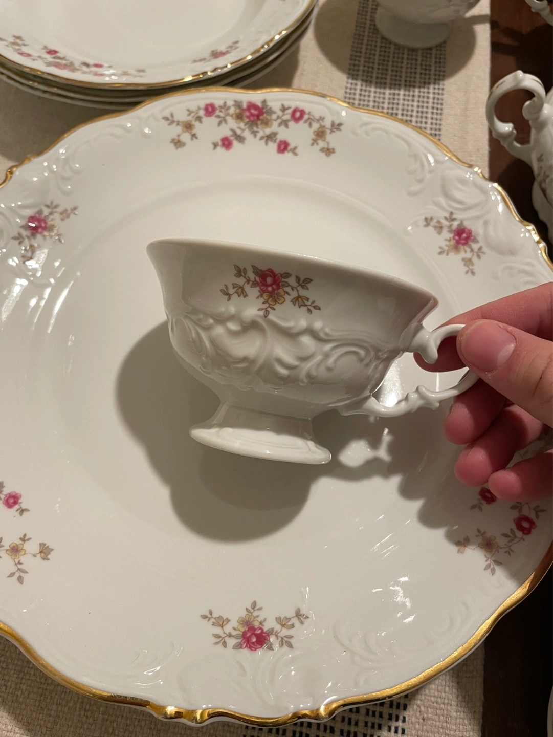 Beautiful vintage Rosenthal Romance dinnerware. Includes plates, cups, saucers, creamer, sugar bowl, and serving bowl. Floral design with gold trim. Excellent for formal dining.