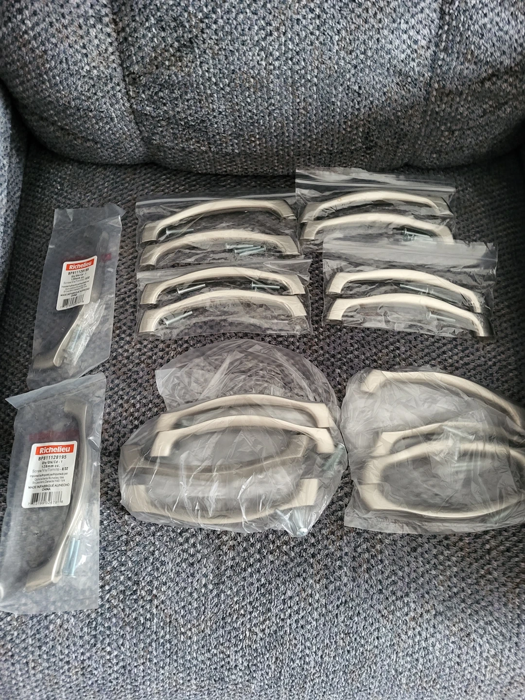 Have 18 Drawer , Cabinet Handles, brand new , never used. Reg price is 12.00 plus tax each at Lowes,so total, taxes in would be $244.00 Brushed Nickel. Must buy all.