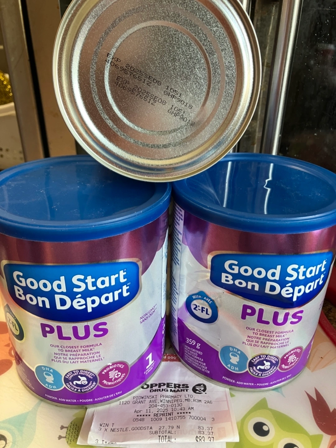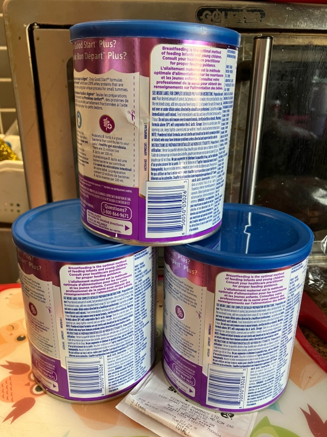 Three cans 359g of Nestle Good Start Plus baby formula. New, unopened. Purchased from Shoppers Drug Mart.