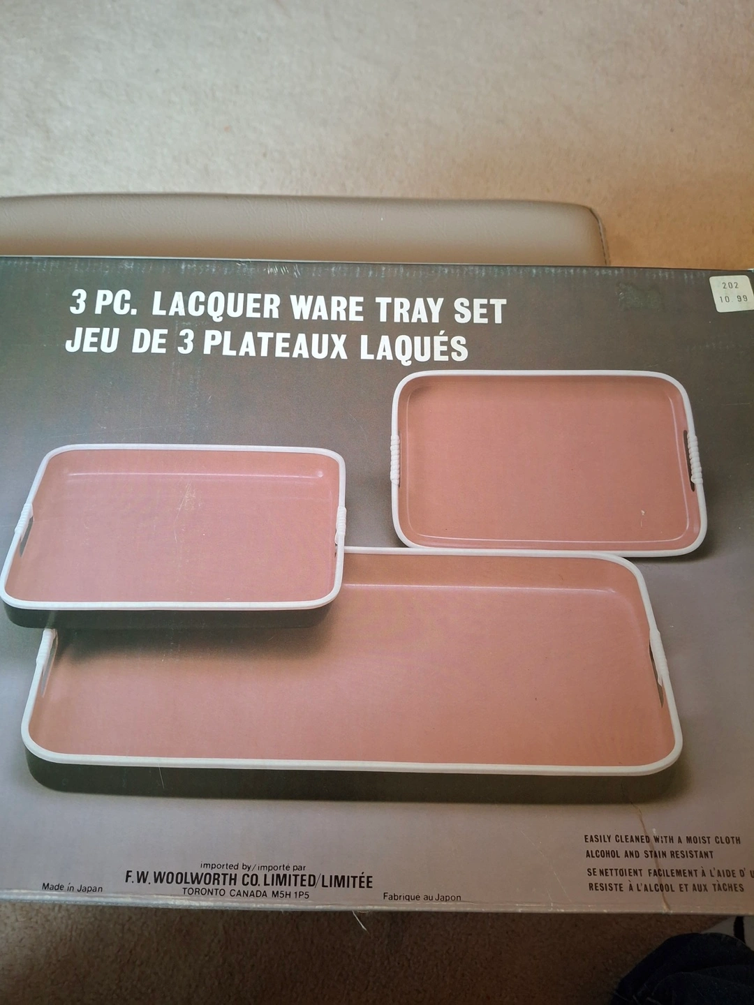 3 trays in original box. Vintage, never used. Dusty rose colour with cut out handles with white trim and black on the bottom. Largest 18.5” x 11.25” Middle 10.5” x 10.5” Small 10.5” x 7” Available for pickup in Markland Wood.