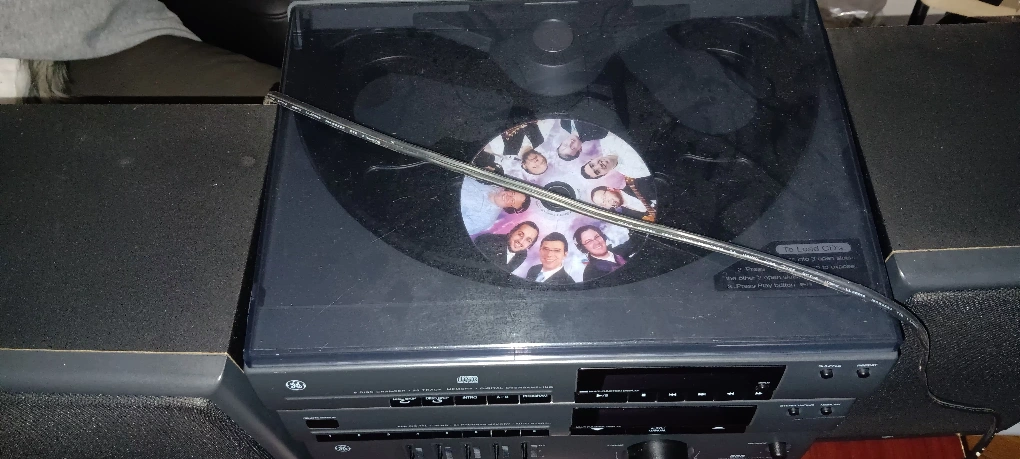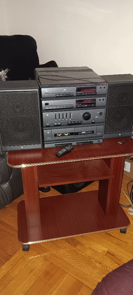 Complete stereo system. Includes CD player, cassette deck, AM/FM radio, and two speakers. Remote included. Great sound quality. table stand & CD included