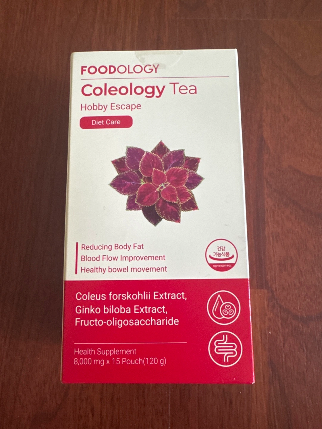 Health supplement tea. Reduces body fat, improves blood flow, promotes healthy bowel movement. Coleus forskohlii, Ginko biloba, and Fructo-oligosaccharide extracts. 15 pouches, 120g total. New and unopened.