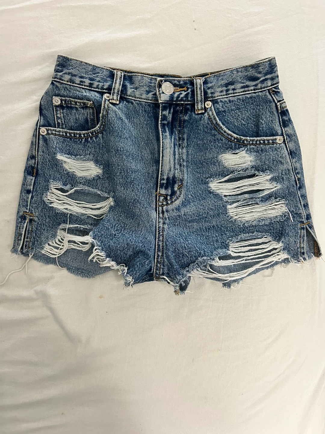 Light wash denim shorts. Ripped and frayed hems. Five-pocket styling. Classic fit. great condition worn few times with care