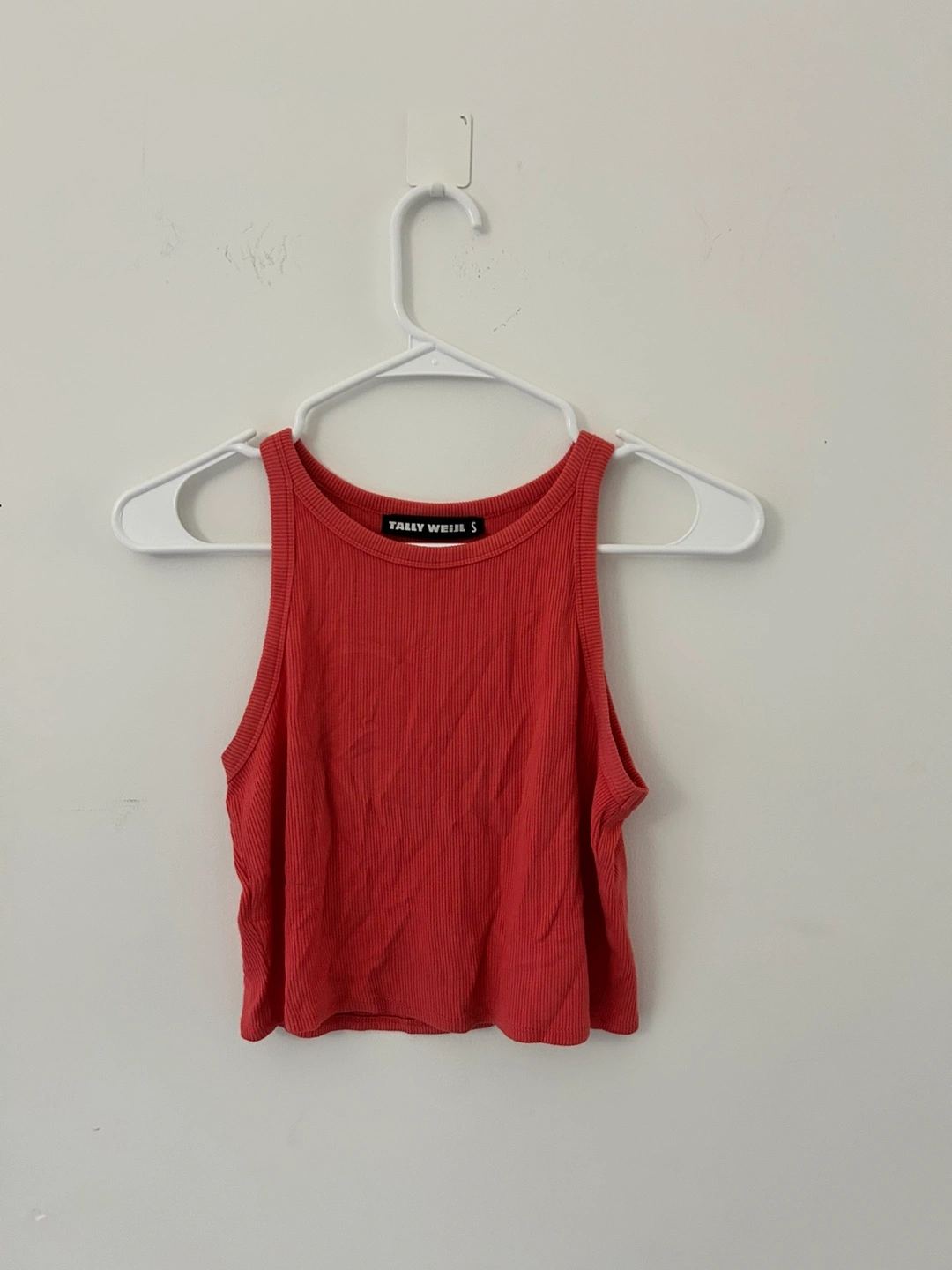 Salmon-coloured ribbed crop tank top. Sleeveless, round neck. good condition, looks wrinkled in the picture needs to be ironed