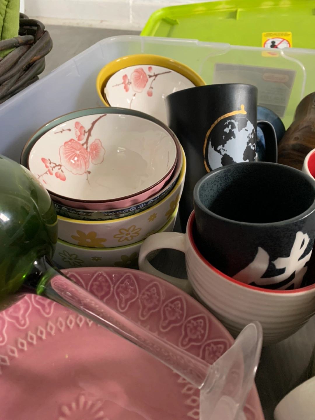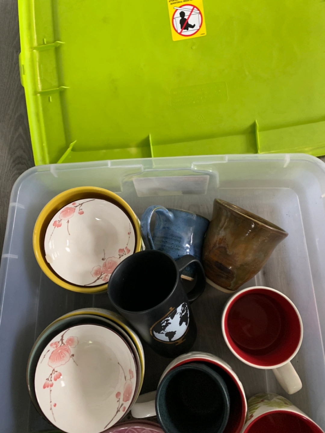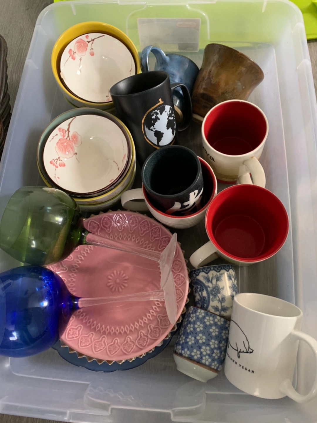 Free kitchen stuff in plastic (under bed sized) bin, included wine glasses, 4 cereal bowls, small Chinese bowls, small tea cups, mugs, two handmaid ceramic mugs, cutlery including steak knives and two bigger knives. Pick up in Parkdale. Moving sale! Will be posting lots for free/cheap.