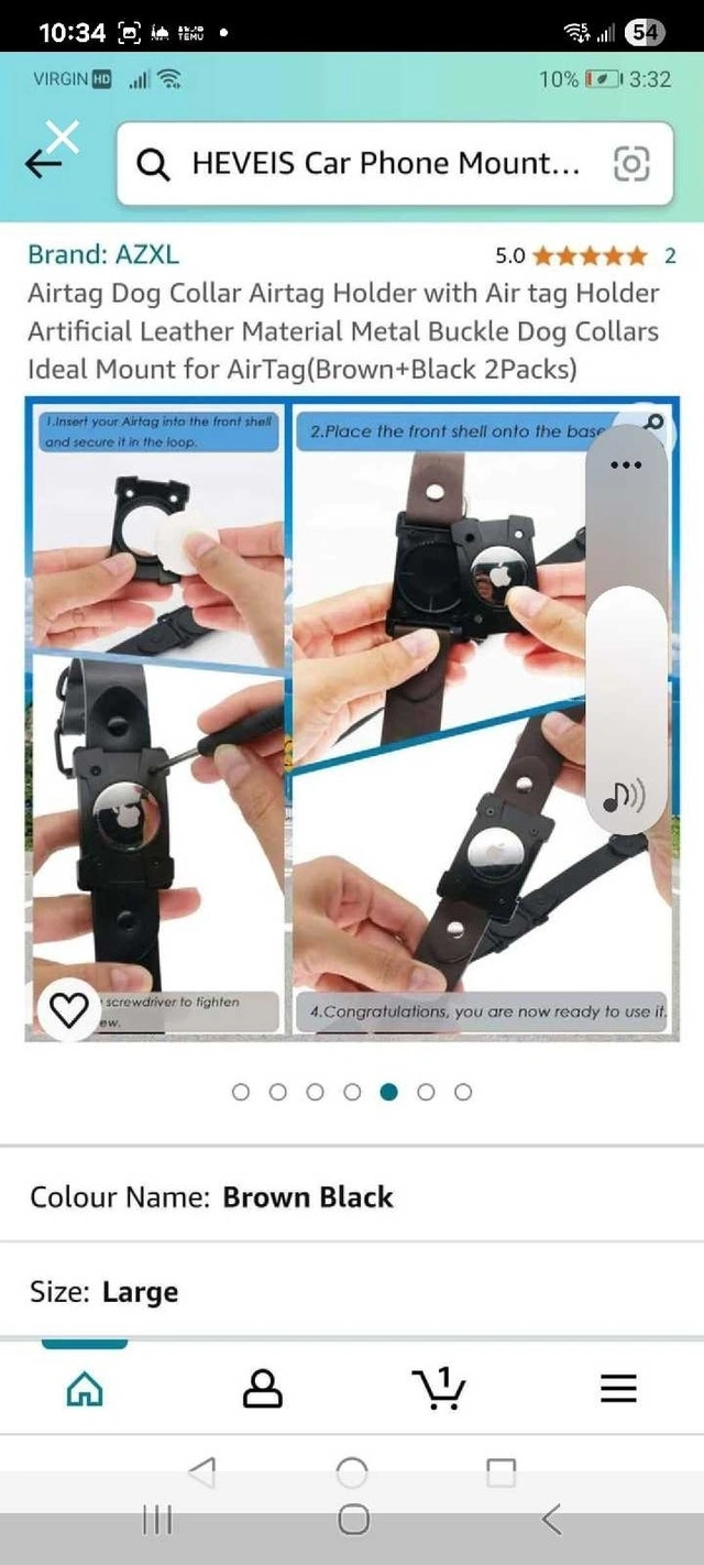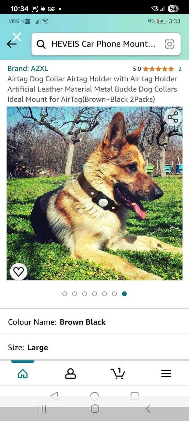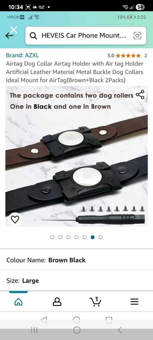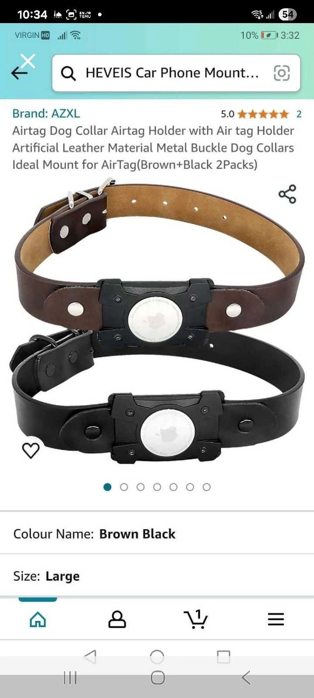Keep track of your furry friend with this AZXL AirTag dog collar, designed to securely hold an AirTag. This package contains two dog collars, one in black and one in brown, both in large size. They feature artificial leather material with a metal buckle, providing both style and durability for your pet. Includes both black and brown collars. Designed to hold an AirTag securely. Material: Artificial leather, metal buckle. Size: Large. Cash accepted.