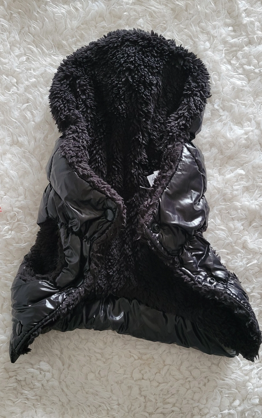 Four adorable small dog outfits. One black collared shirt, one blue pineapple print shirt, one black puffer jacket, and one blue hooded jacket. Perfect for 12-15 lbs medium-sized male dogs