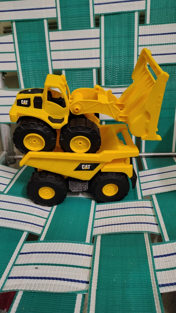 65Yellow plastic toy dump truck and front loader. Ideal for imaginative play. Both pieces feature CAT branding. 10 for both or 5 each