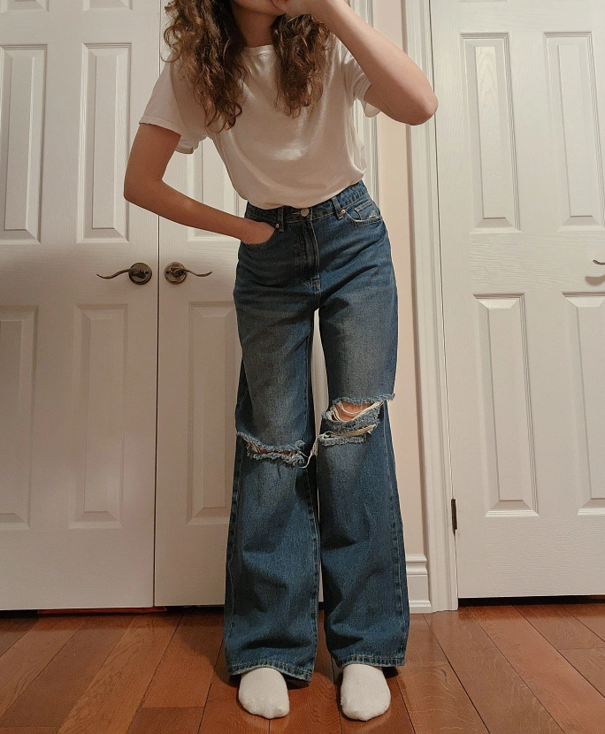 Very comfy, baggy ripped jeans. I also sized up for an extra comfy fit so they just sit on my hips without a belt. Wore these often but they remain in great condition! Size 7 from Forever 21.