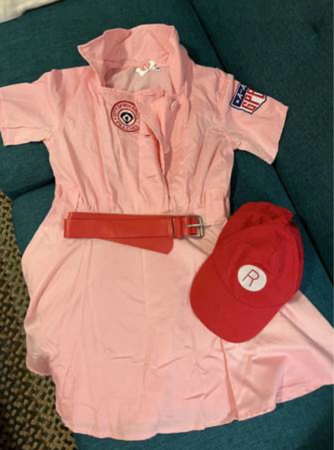 Rockford Peach costume; A League of Their Own • Adorable pink dress with short sleeves, button closure, and a matching red belt. Includes a red baseball cap with a white 'R' logo. Perfect for a themed party or cosplay.