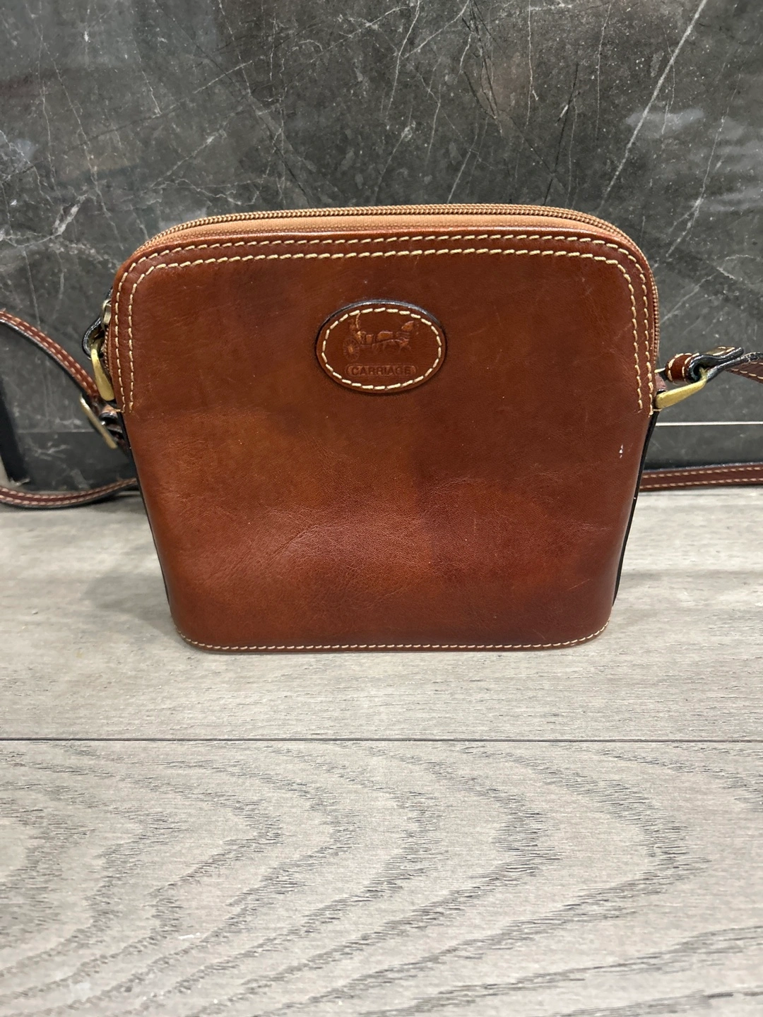Brown leather crossbody bag. Small, square shape. Zip closure. Adjustable strap. Interior zip pocket. Pre-owned.