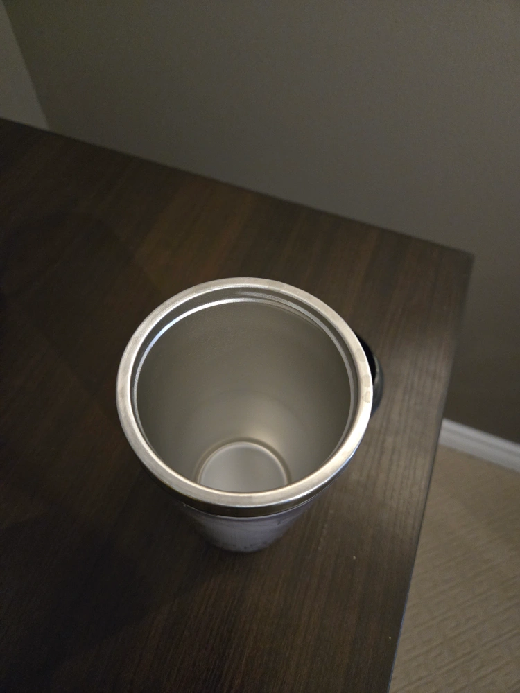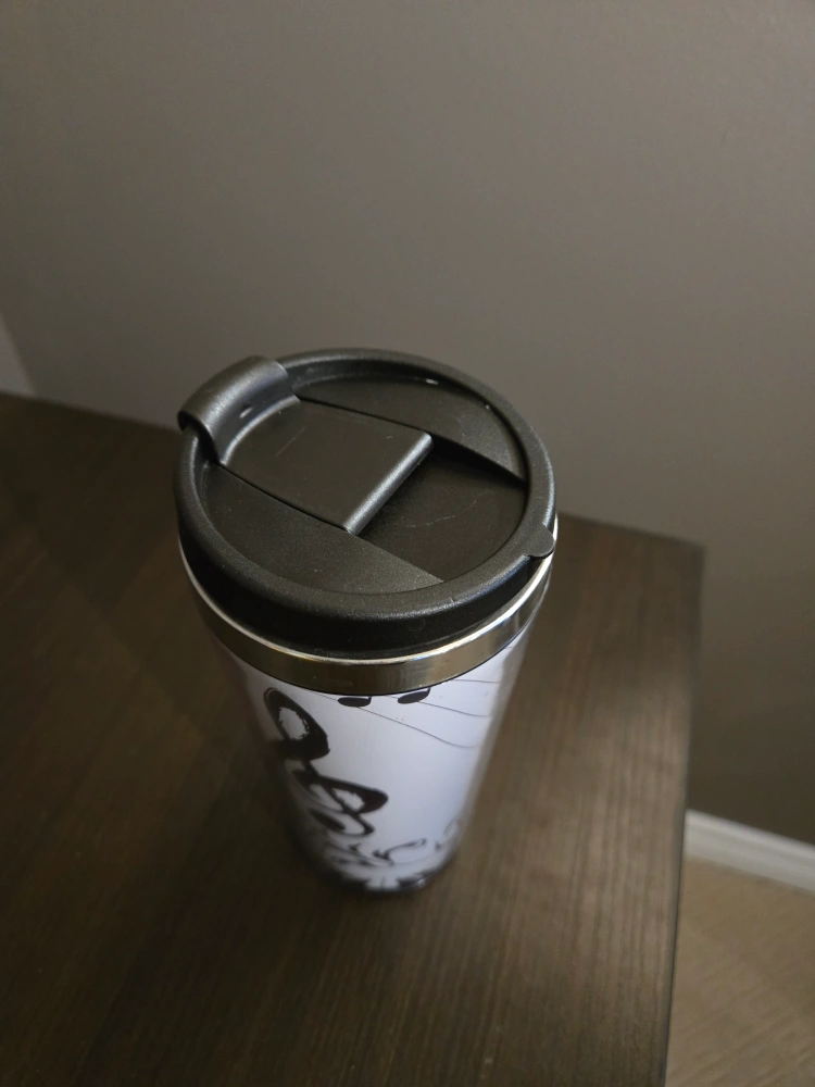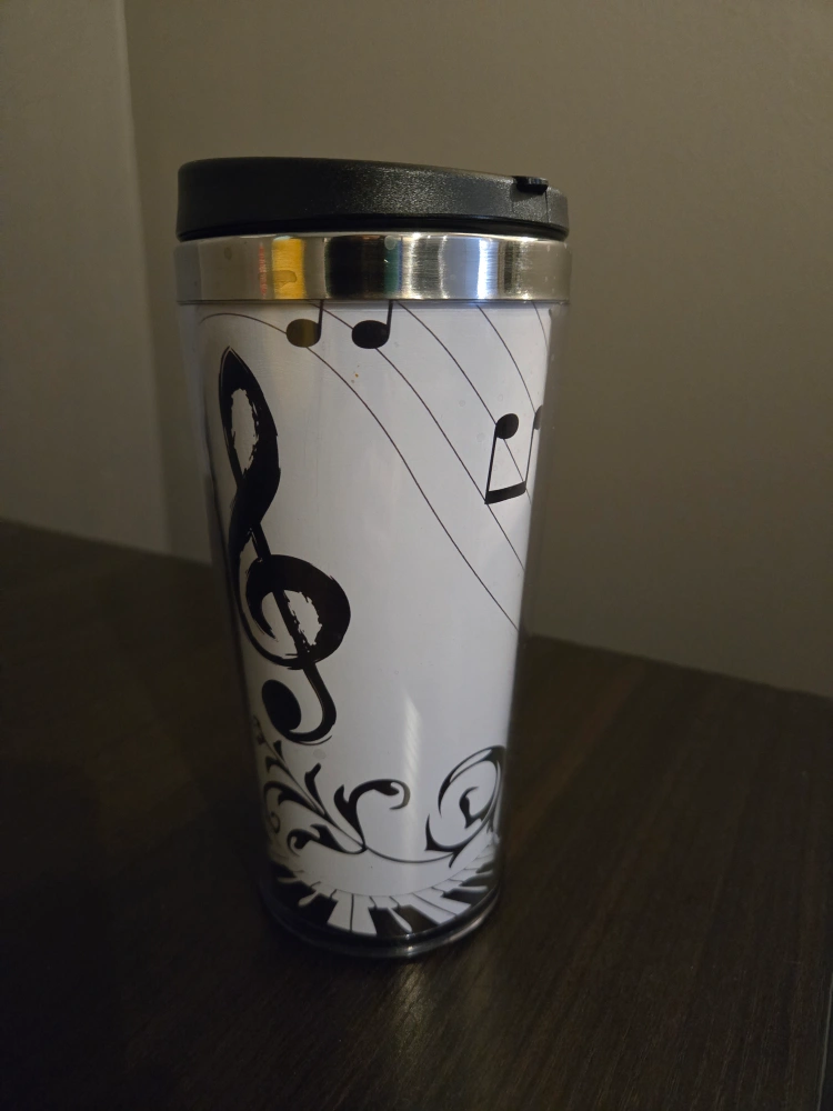 Reusable travel mug. Features musical notes and treble clef design. Black plastic lid. Never used!