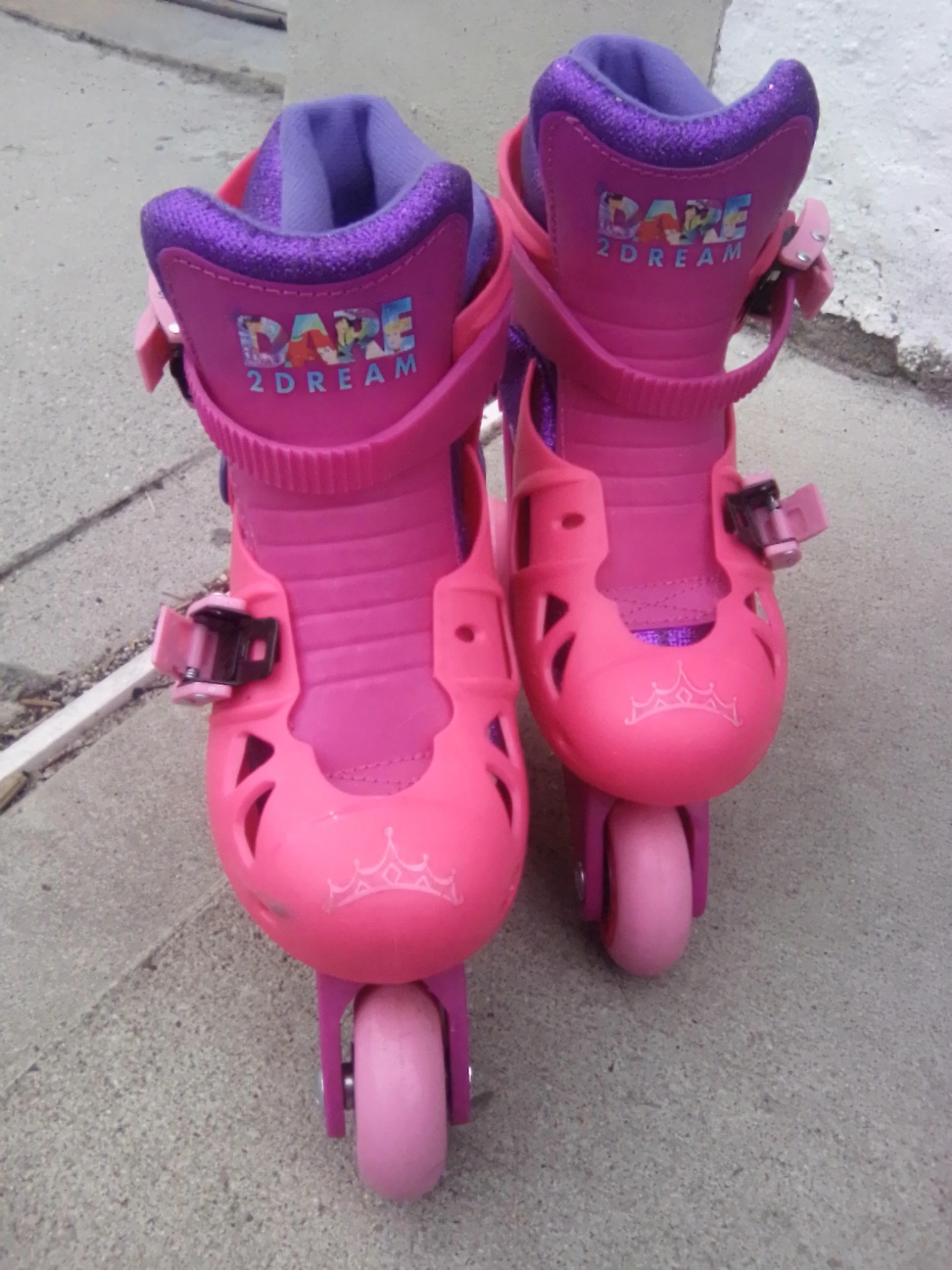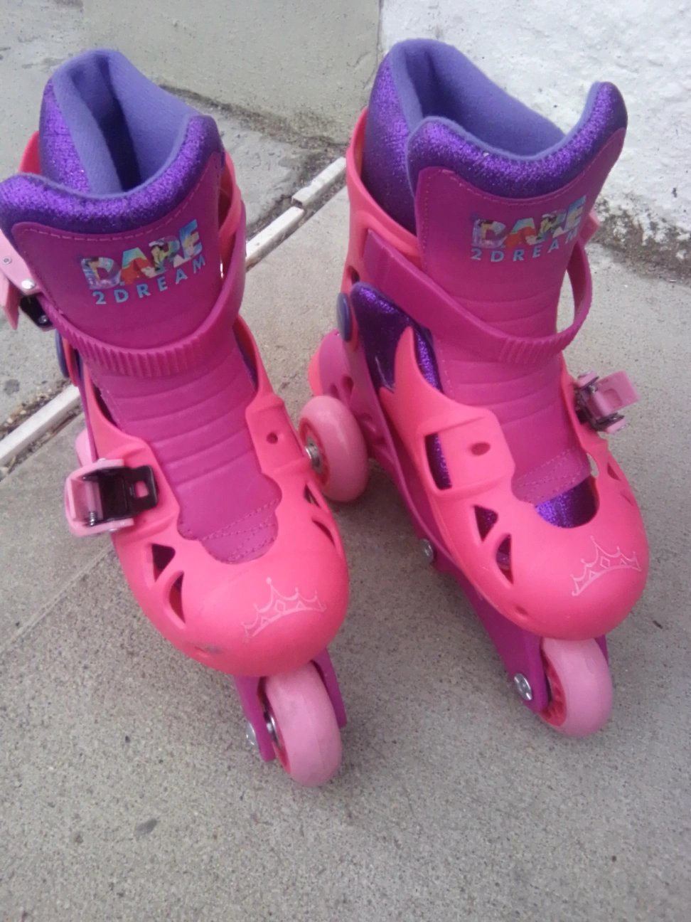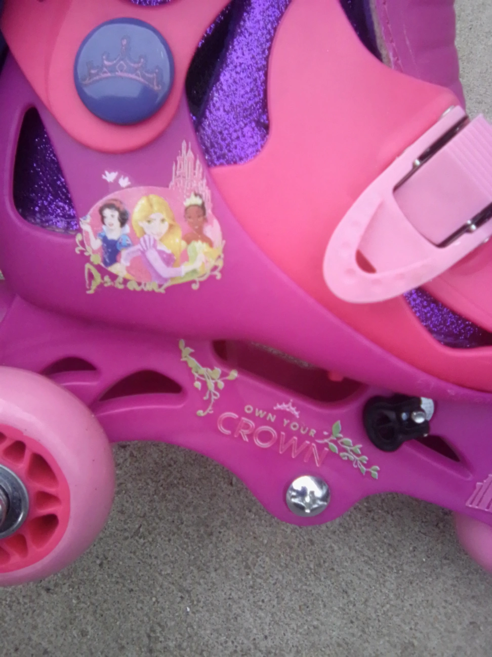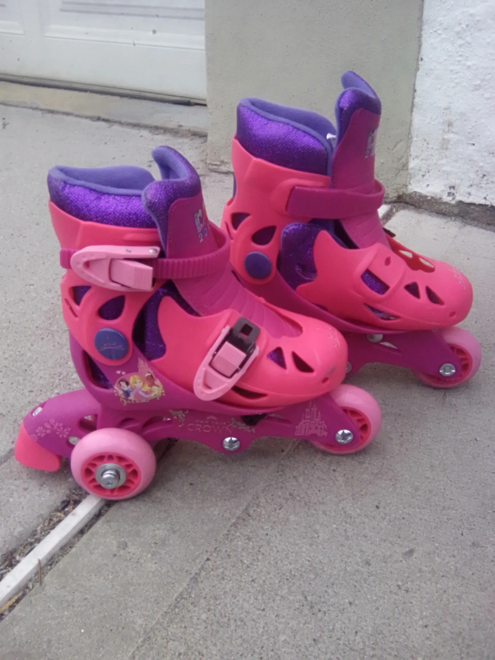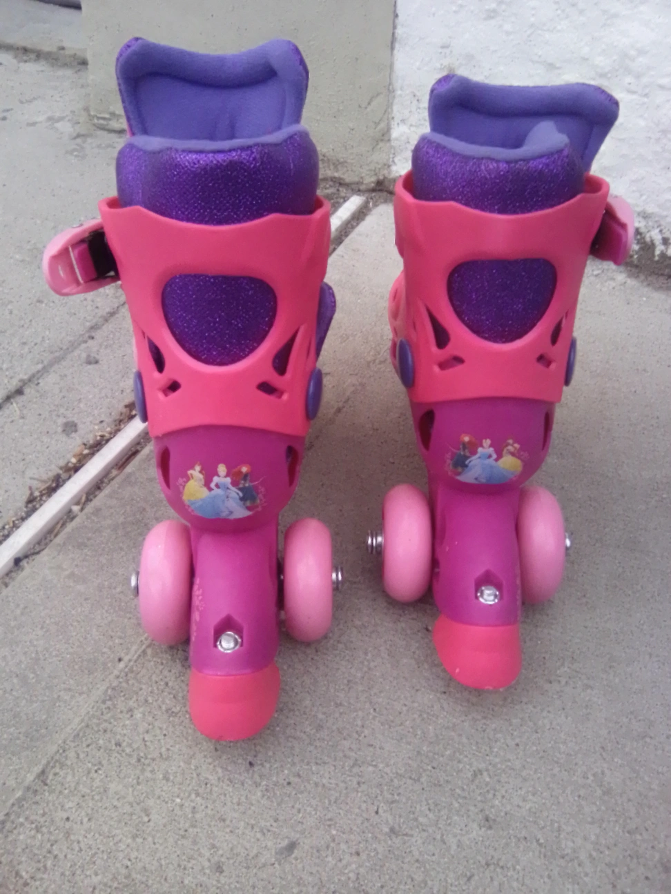 Girls' pink and purple roller skates. Feature Disney Princesses. Size J6-J9. Great for beginners. Bottom strap removed cannot find. Sold as is. Pickup in Astoria Queens.