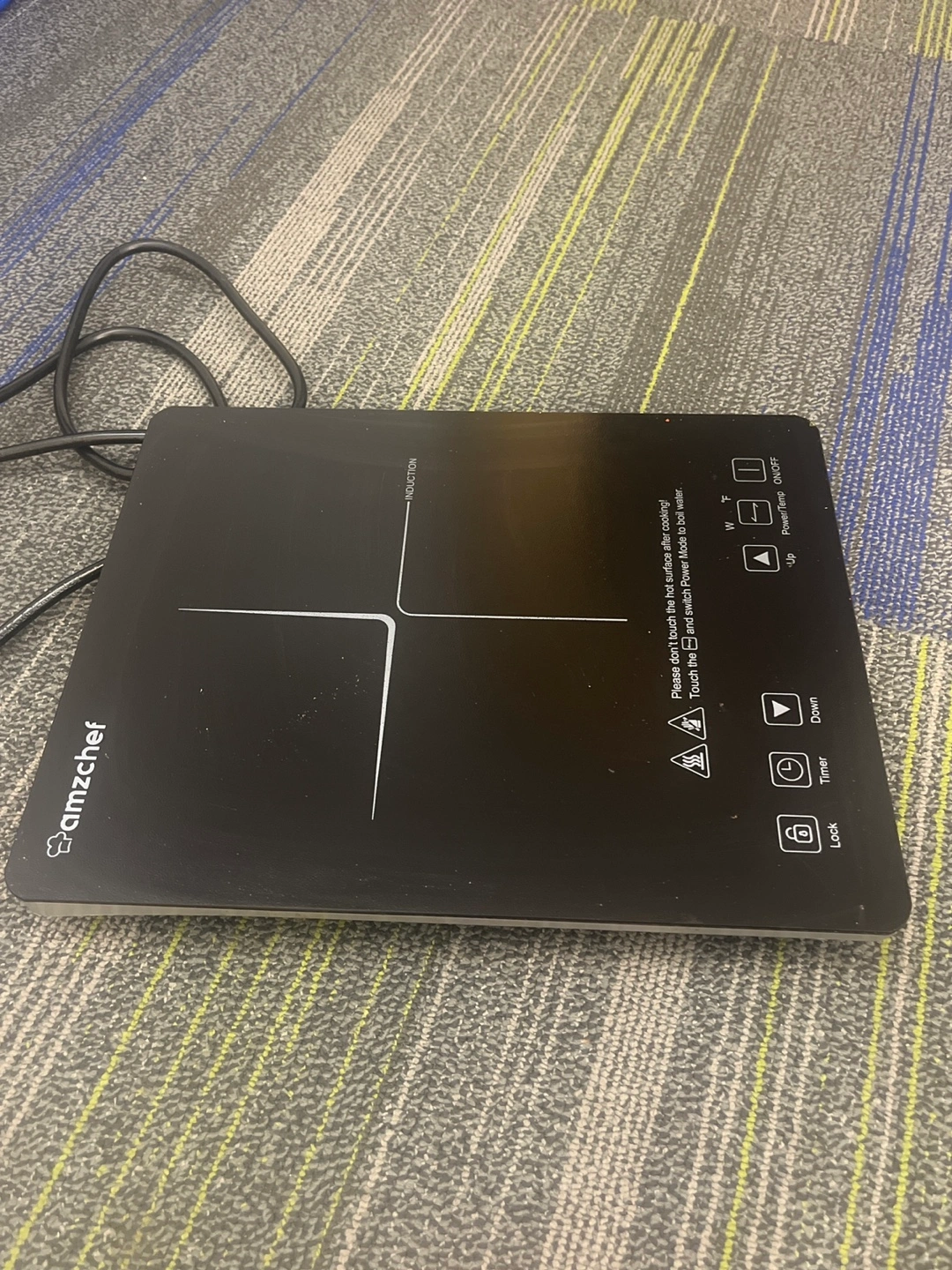 55Portable single burner induction cooktop. Black colour. Features temperature and timer controls. Includes power cord.