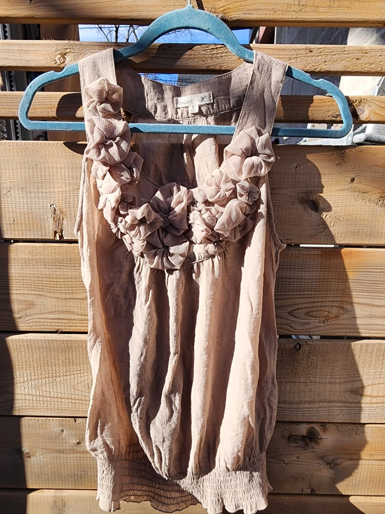 199Adorable beige sleeveless blouse with floral and rhinestone details.