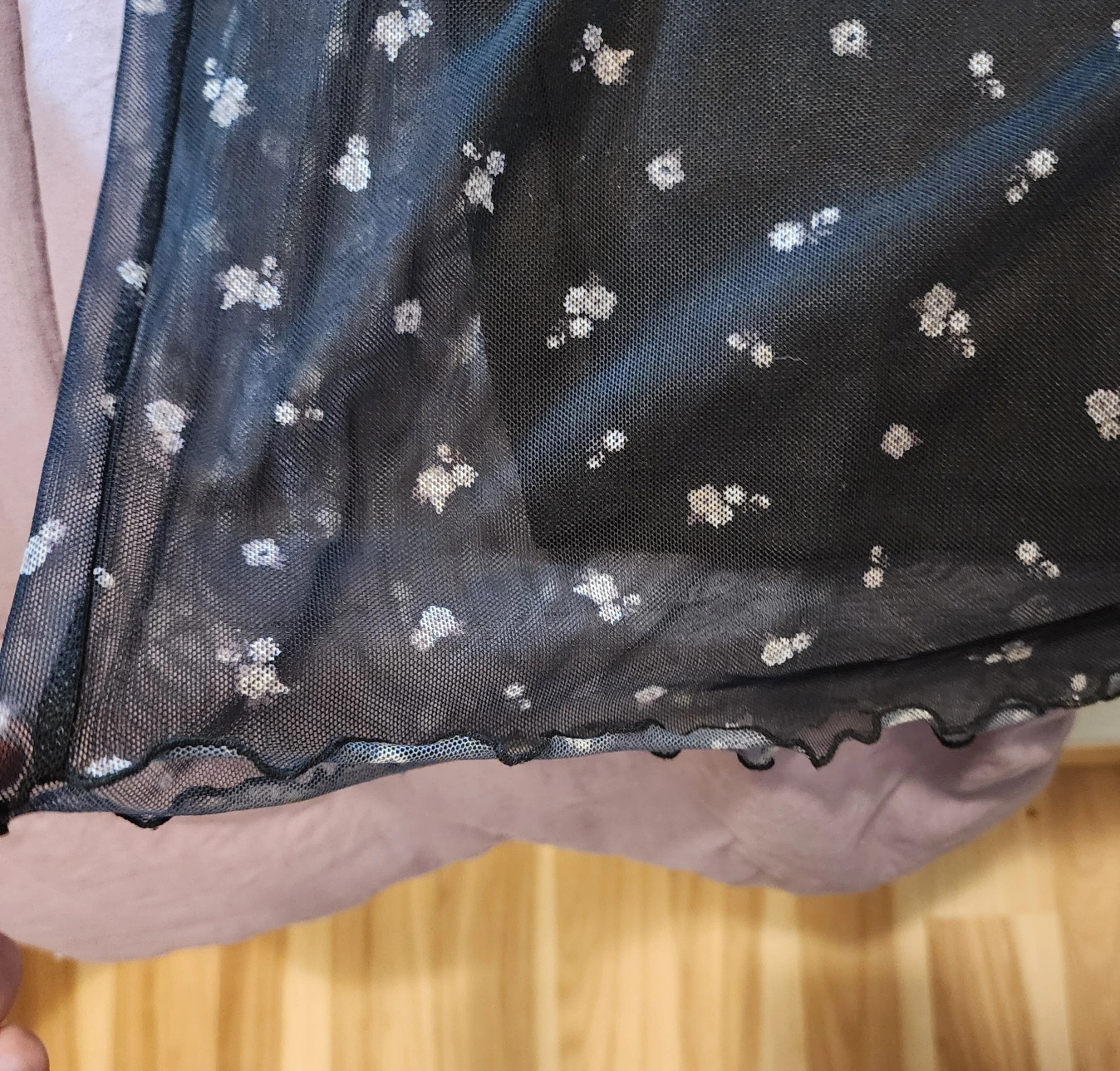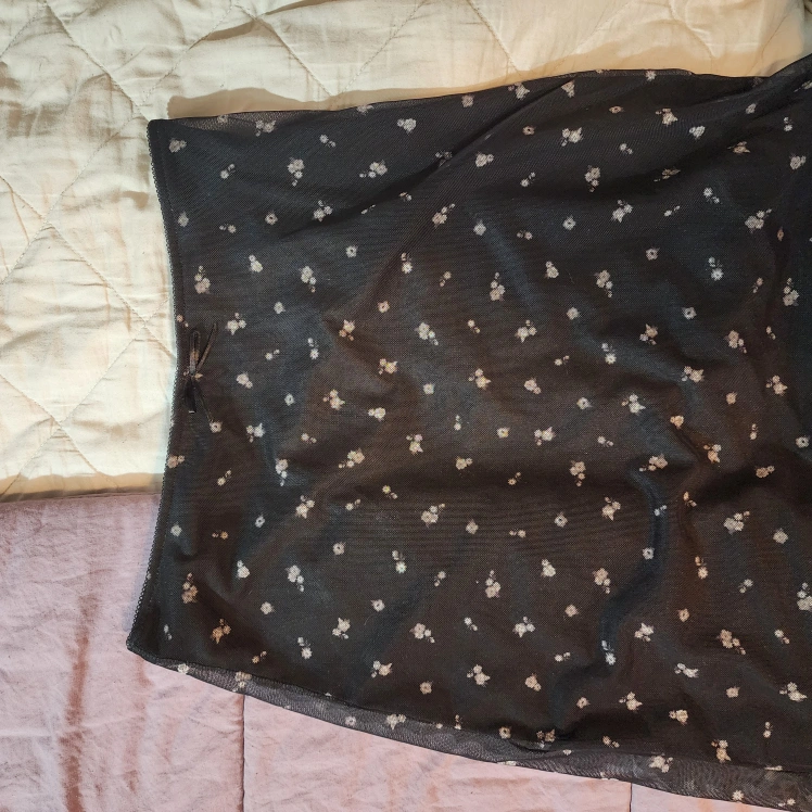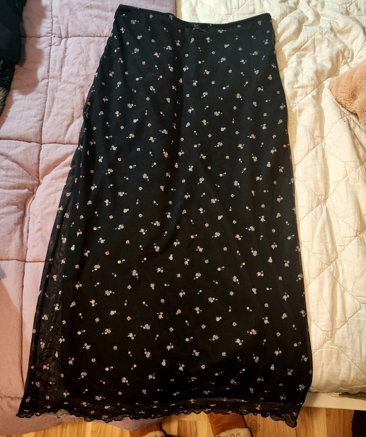 199Black sheer overlay maxi skirt. Floral print. Scalloped hem. Size Medium. Only worn a couple of times– super witchy & cute