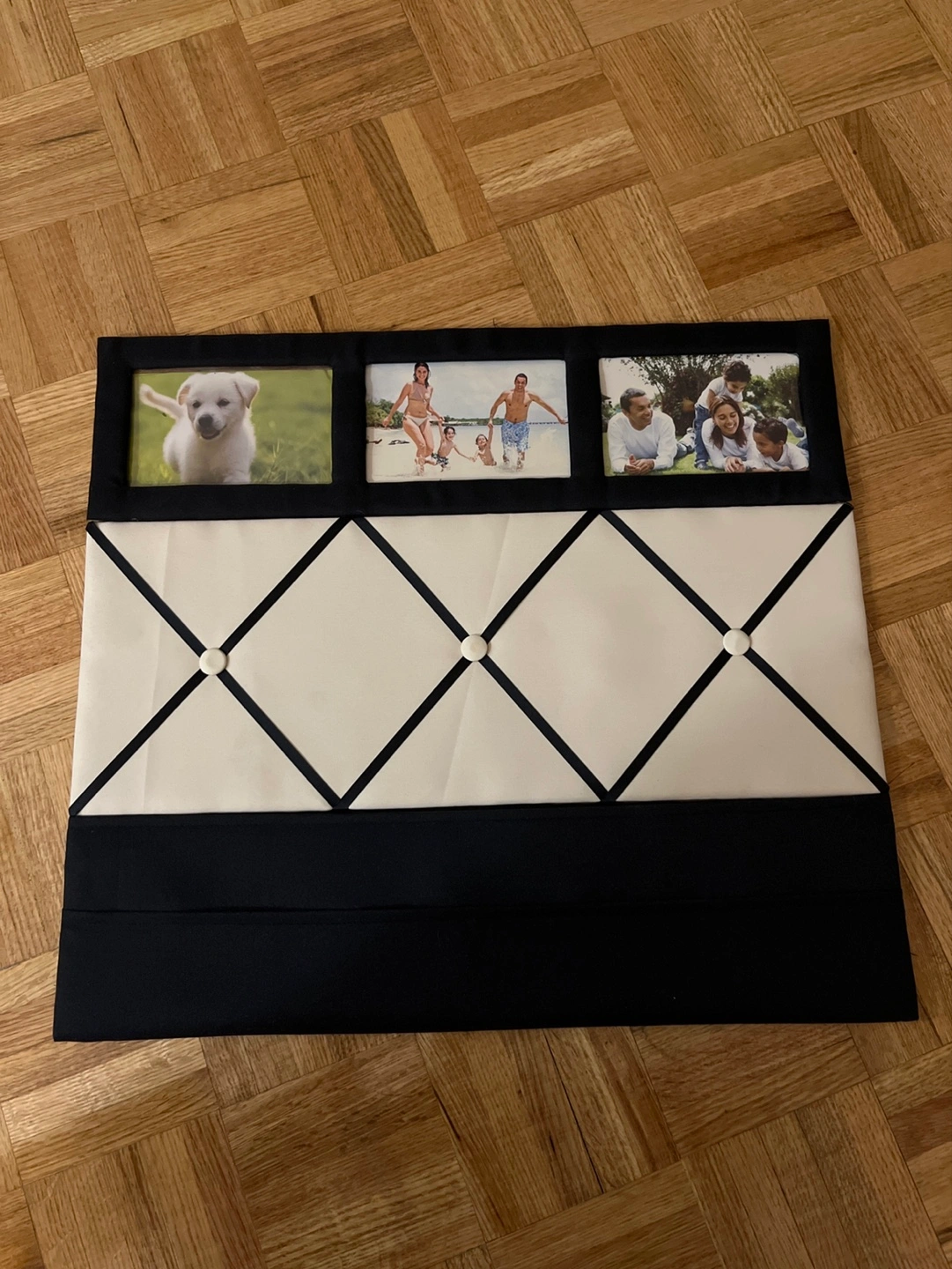 Fabric photo display board. Features three photo slots at the top and a board below to hang things. Black and cream colour scheme. Perfect for displaying cherished memories.