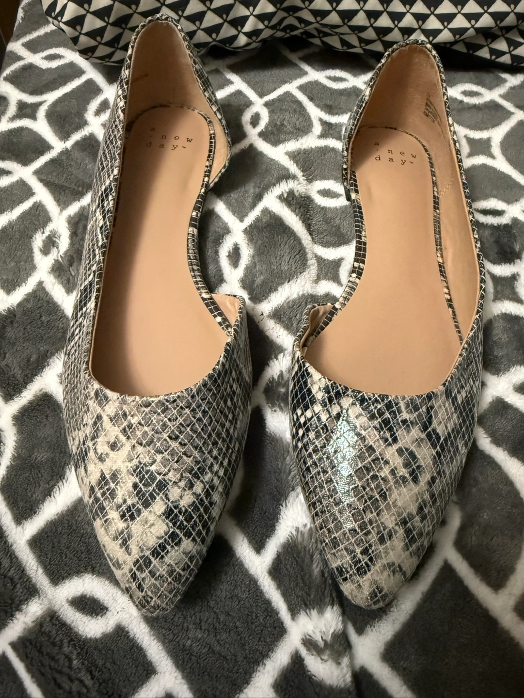 763Pair of women's flats. Snakeskin print. Pointy toe. Size 7 1/2. Slight wear.