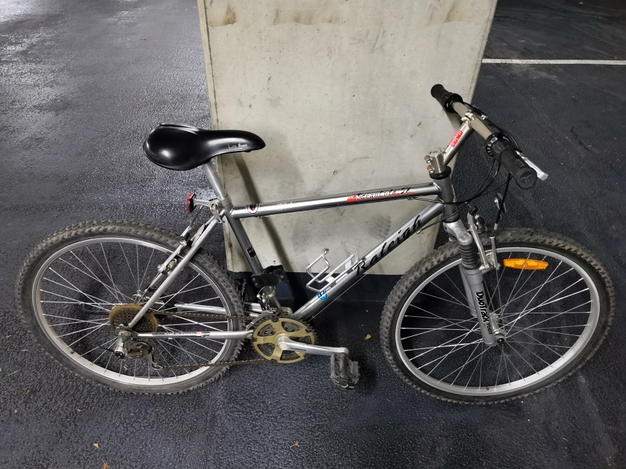 Raleigh mountain bike. 20" silver frame. 26" wheels. Comes with a bunch of accessories (soft seating, new soft handles, frame bag, waterproof cover).